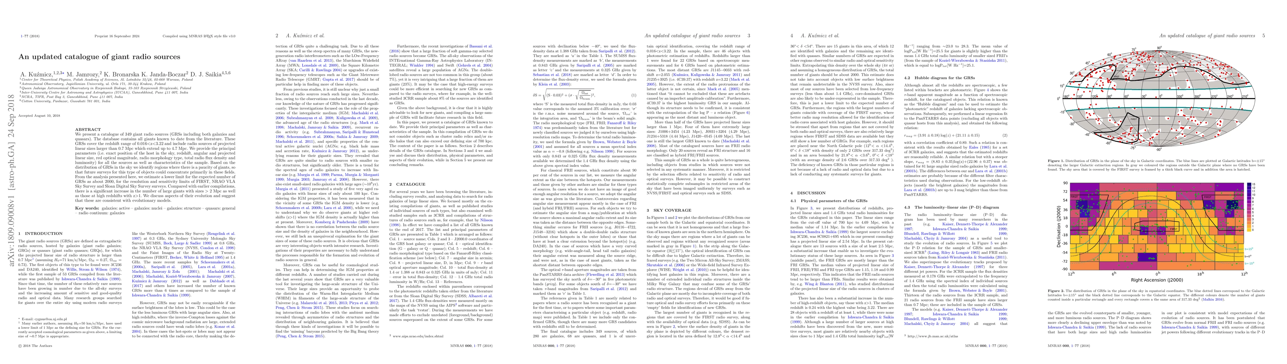 This paper updates a catalogue of 349 giant radio sources (GRSs), detailing their positions, sizes, and other parameters, and estimates a lower limit of 2000 GRSs exist. It identifies under-surveyed regions for future GRS searches and notes an increase in large and high-redshift GRSs, consistent with evolutionary models.