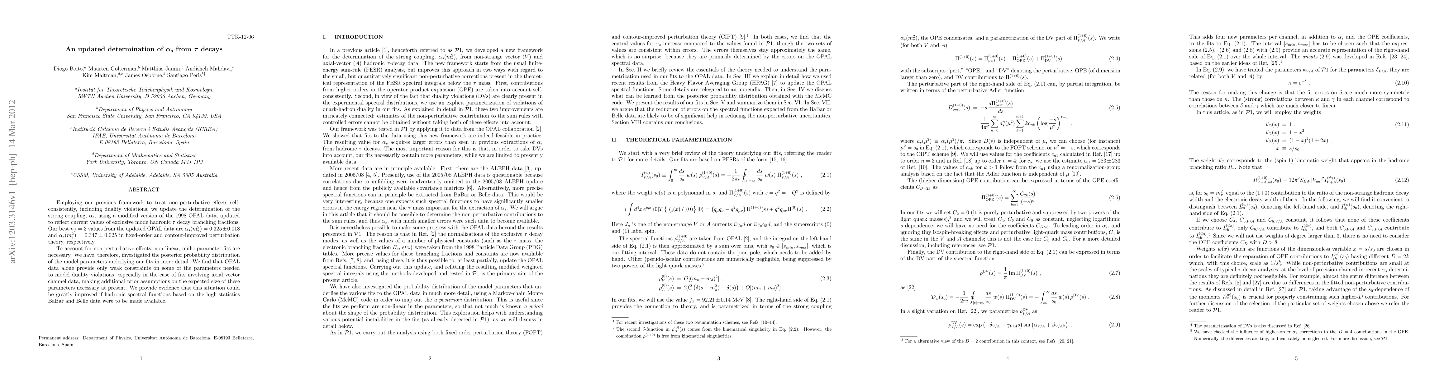 Employing our previous framework to treat non-perturbative effects self-consistently, including duality violations, we update the determination of the strong coupling, \alpha_s, using a modified version of the 1998 OPAL data, updated to reflect current values of exclusive mode hadronic \tau decay branching fractions. Our best n_f=3 values from the updated OPAL data are \alpha_s(m^2_\tau)=0.325+-0.018 and \alpha_s(m^2_\tau)=0.347+-0.025 in fixed-order and contour-improved perturbation theory, respectively. To account for non-perturbative effects, non-linear, multi-parameter fits are necessary. We have, therefore, investigated the posterior probability distribution of the model parameters underlying our fits in more detail. We find that OPAL data alone provide only weak constraints on some of the parameters needed to model duality violations, especially in the case of fits involving axial vector channel data, making additional prior assumptions on the expected size of these parameters necessary at present. We provide evidence that this situation could be greatly improved if hadronic spectral functions based on the high-statistics BaBar and Belle data were to be made available.