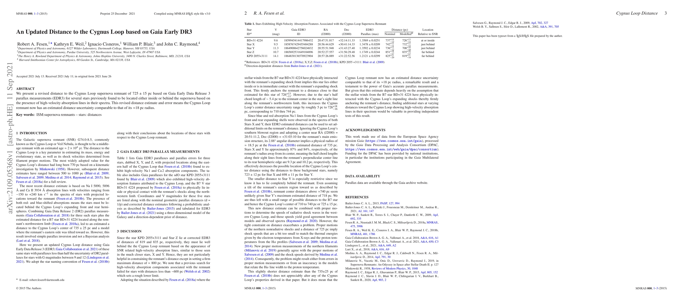 We present a revised distance to the Cygnus Loop supernova remnant of $725\pm15$ pc based on Gaia Early Data Release 3 parallax measurements (EDR3) for several stars previously found to be located either inside or behind the supernova based on the presence of high-velocity absorption lines in their spectra. This revised distance estimate and error means the Cygnus Loop remnant now has an estimated distance uncertainty comparable to that of its $\simeq$18 pc radius.