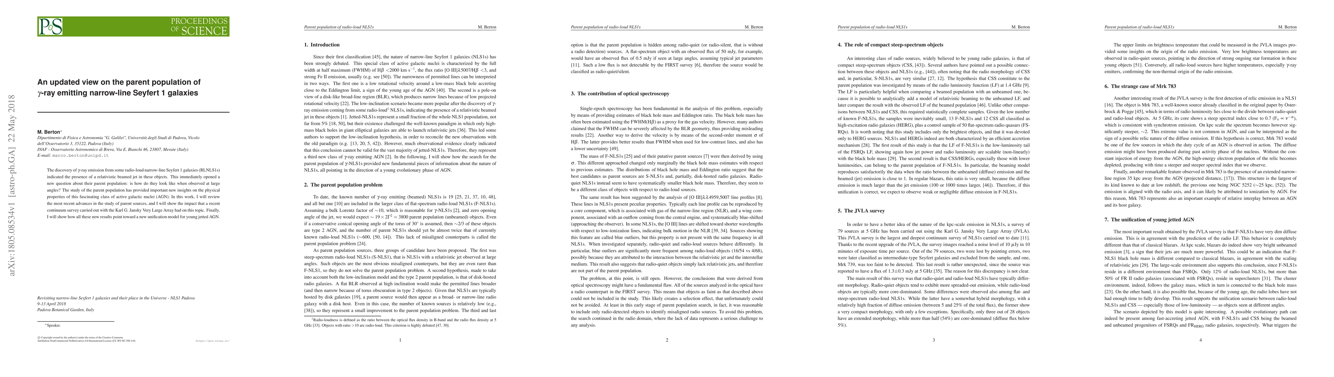 The discovery of $\gamma$-ray emission from some radio-loud narrow-line Seyfert 1 galaxies (RLNLS1s) indicated the presence of a relativistic beamed jet in these objects. This immediately opened a new question about their parent population: is how do they look like when observed at large angles? The study of the parent population has provided important new insights on the physical properties of this fascinating class of active galactic nuclei (AGN). In this work, I will review the most recent advances in the study of parent sources, and I will show the impact that a recent continuum survey carried out with the Karl G. Jansky Very Large Array had on this topic. Finally, I will show how all these new results point toward a new unification model for young jetted AGN.