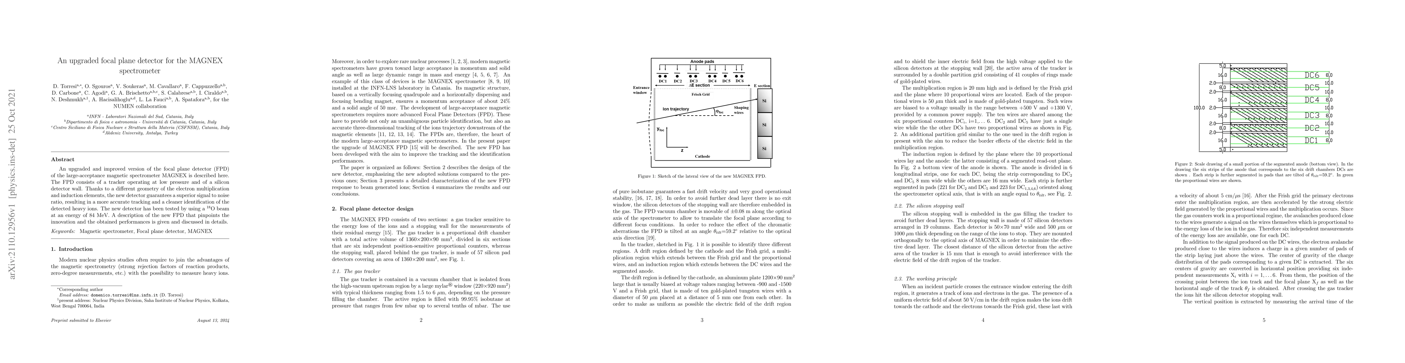 This paper describes an upgraded focal plane detector for the MAGNEX spectrometer, featuring improved geometry for electron multiplication and induction, which enhances signal-to-noise ratio and accuracy in tracking and identifying heavy ions. The new detector was tested with a $^{18}$O beam at 84 MeV, demonstrating its superior performance.