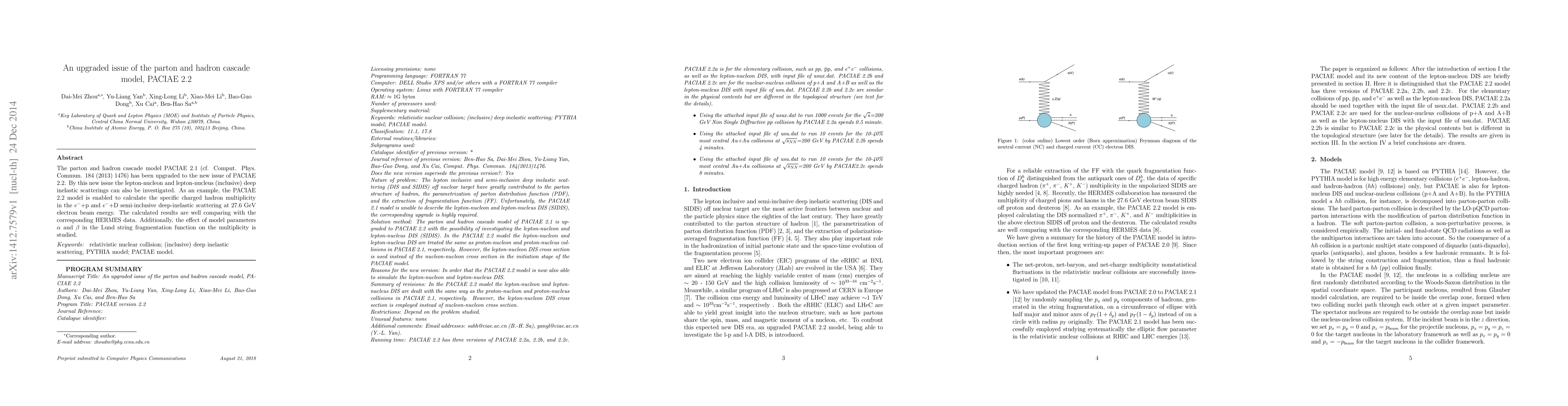 The upgraded parton and hadron cascade model, PACIAE 2.2, extends PACIAE 2.1 to include lepton-nucleon and lepton-nucleus deep inelastic scatterings, demonstrating its capability with specific charged hadron multiplicity calculations in $e^-$+p and $e^-$+D interactions at 27.6 GeV, showing good agreement with HERMES data. The model's sensitivity to parameters \alpha and \beta in the Lund string fragmentation function is also studied.