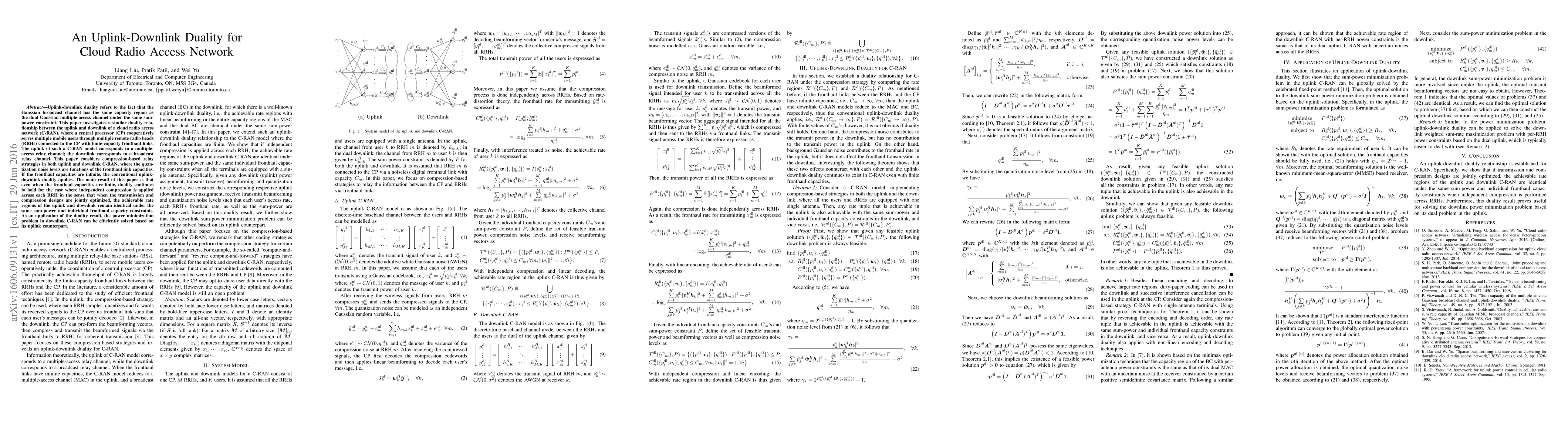 This paper explores the uplink-downlink duality in cloud radio access networks (C-RAN), demonstrating that despite finite fronthaul capacities, the achievable rate regions for uplink and downlink remain identical under optimized transmission and compression strategies. This duality enables efficient power minimization in downlink C-RAN by leveraging the uplink counterpart.