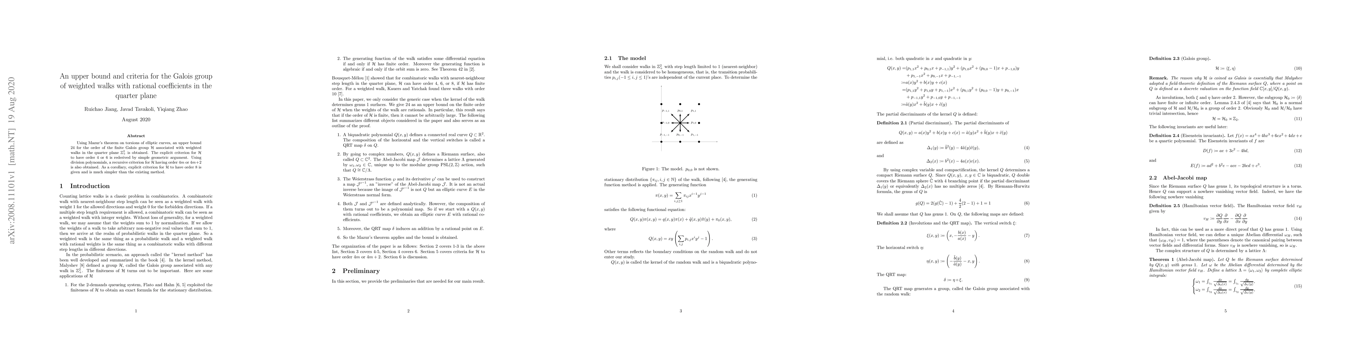 This paper establishes an upper bound of 24 for the Galois group $\mathcal{H}$ of weighted walks in the quarter plane, leveraging Mazur's torsion theorem. It provides a simpler geometric criterion for $\mathcal{H}$ to have orders 4, 6, and 8, and a recursive criterion for orders 4m and 4m+2 using division polynomials.
