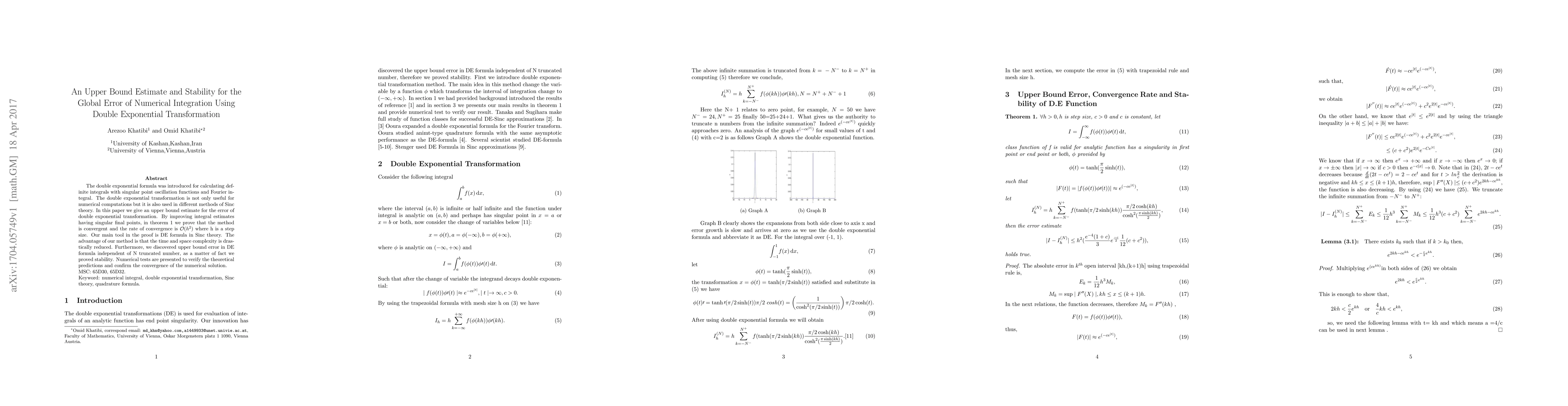 This paper provides an upper bound estimate for the error of the double exponential transformation in numerical integration, proving its convergence with a $\mathcal{O}(h^2)$ rate. The method significantly reduces time and space complexity, and demonstrates stability independent of the truncation number, confirmed by numerical tests.