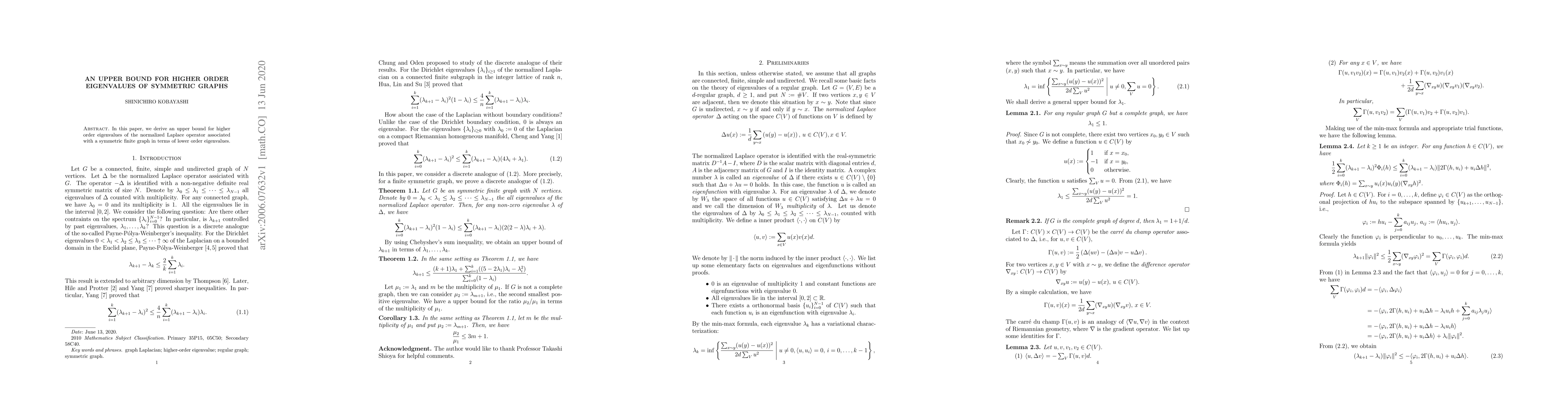 A paper derives an upper bound for higher-order eigenvalues of symmetric graphs in terms of lower-order eigenvalues, offering a significant insight into graph spectral properties.
