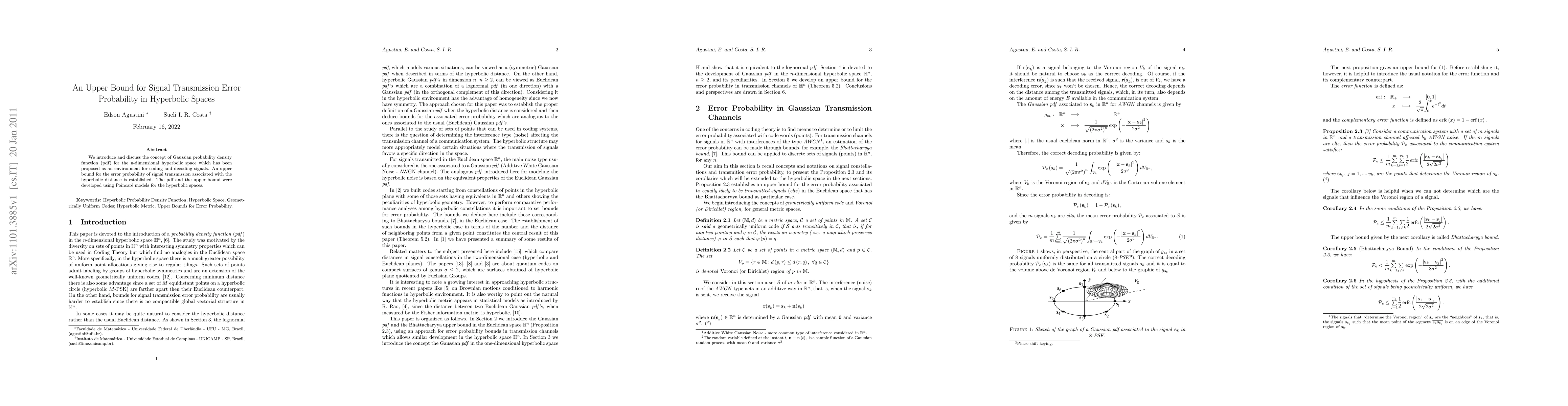Researchers establish an upper bound for signal transmission error probability in hyperbolic spaces using Poincare models, introducing a Gaussian probability density function for n-dimensional hyperbolic space.