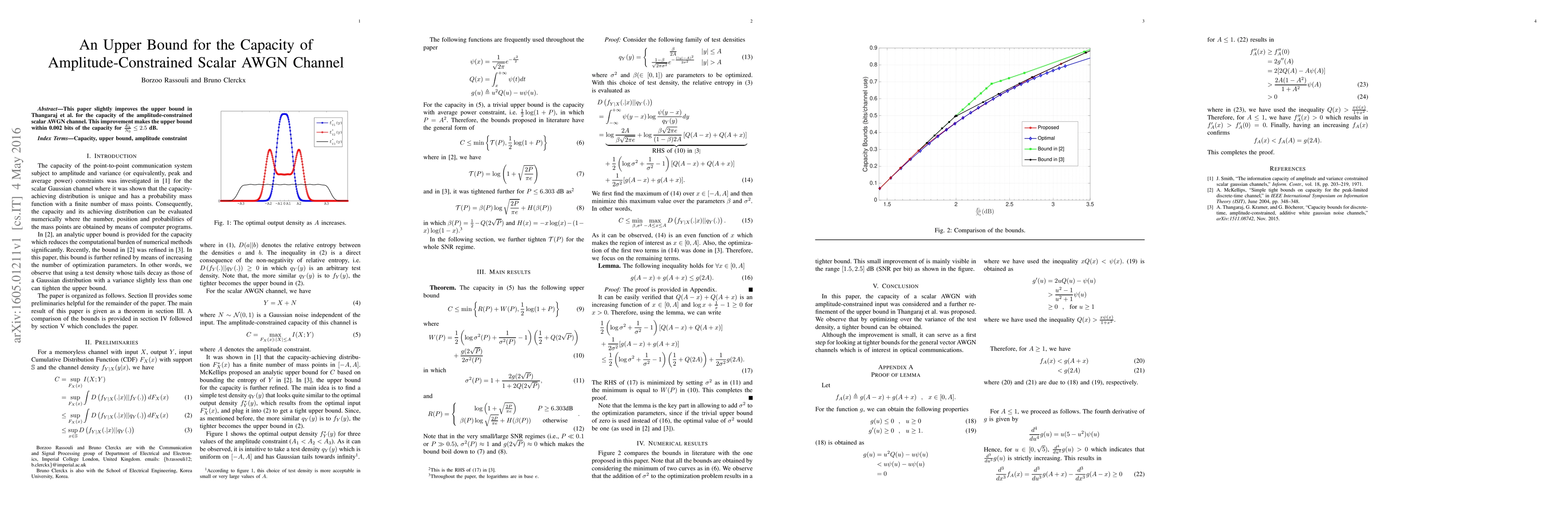 This paper refines the upper bound for the capacity of the amplitude-constrained scalar AWGN channel, achieving an accuracy within 0.002 bits for signal-to-noise ratios up to 2.5 dB. The improvement builds upon previous work by Thangaraj et al.