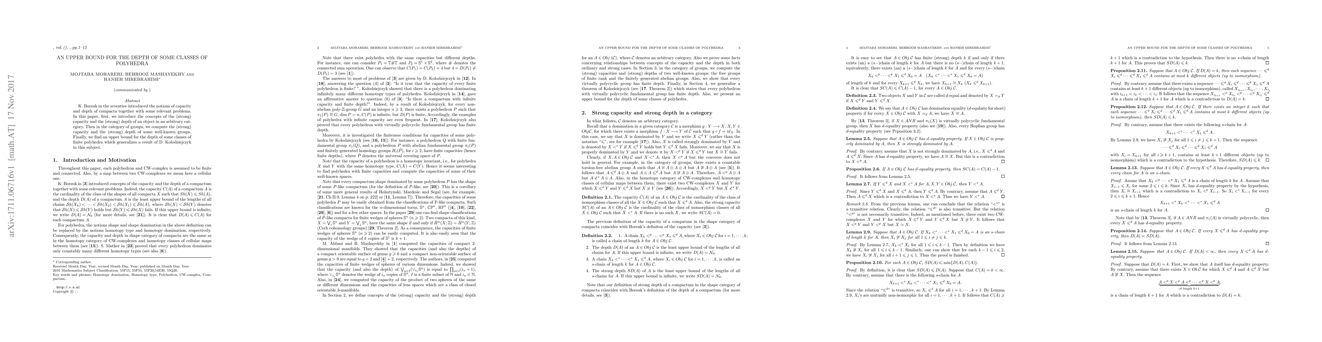 This paper extends the concepts of capacity and depth from compacta to arbitrary categories, computes these measures for specific groups, and establishes an upper bound for the depth of certain classes of finite polyhedra, generalizing prior work by D. Kolodziejczyk.