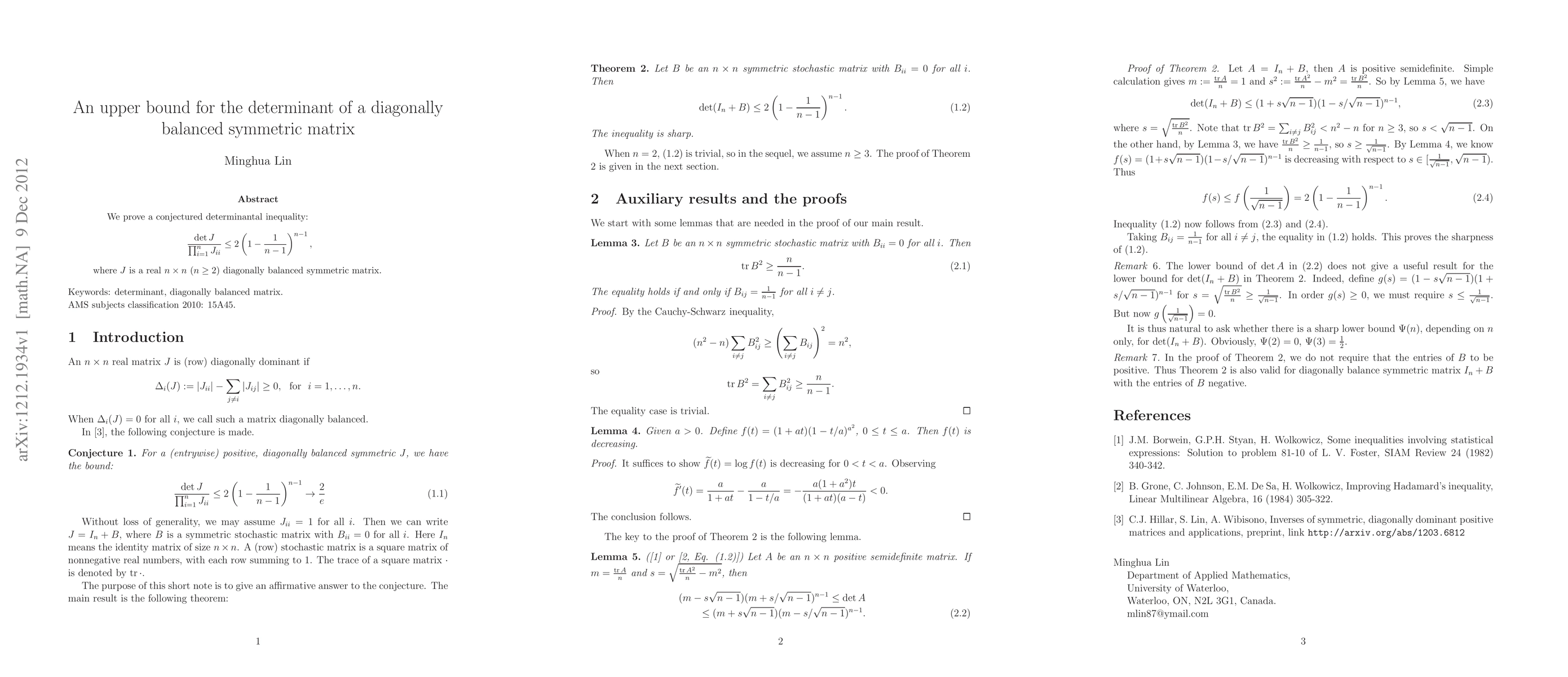 This research paper presents a proof for a conjectured inequality concerning the determinant of a specific type of symmetric matrix, called diagonally balanced, showing that rac{det J}{prod_{i=1}^nJ_{ii}}le 2(1-rac{1}{n-1})^{n-1} for n x n matrices with n ≥ 2.