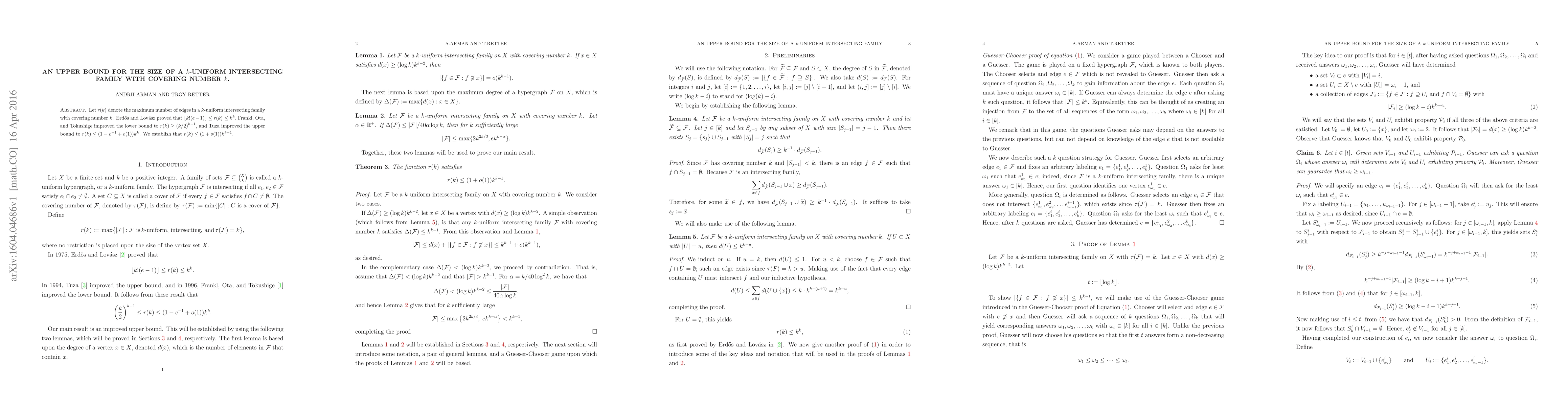 This paper establishes an upper bound for the size of a $k$-uniform intersecting family with covering number $k$, showing that $r(k) \leq (1 + o(1)) k^{k-1}$, improving previous results by Tuza.