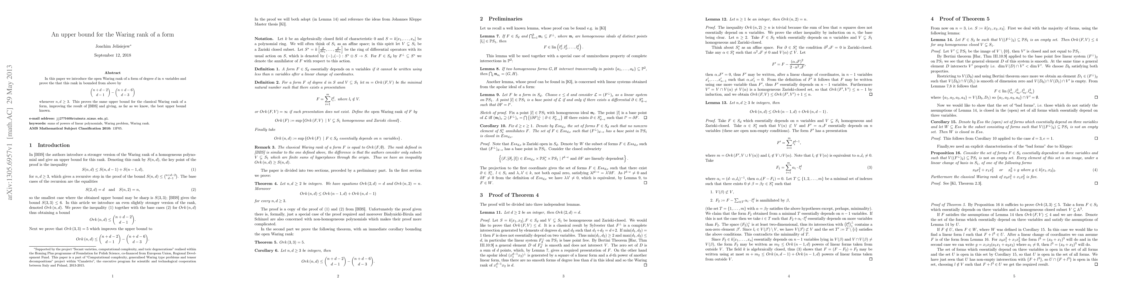 This paper establishes an upper bound for the Waring rank of a form of degree d in n variables, proving it to be \(\binom{n+d-2}{d-1} - \binom{n+d-6}{d-3}\) for \(n, d \geq 3\), which improves upon previous results and represents the best known upper bound.