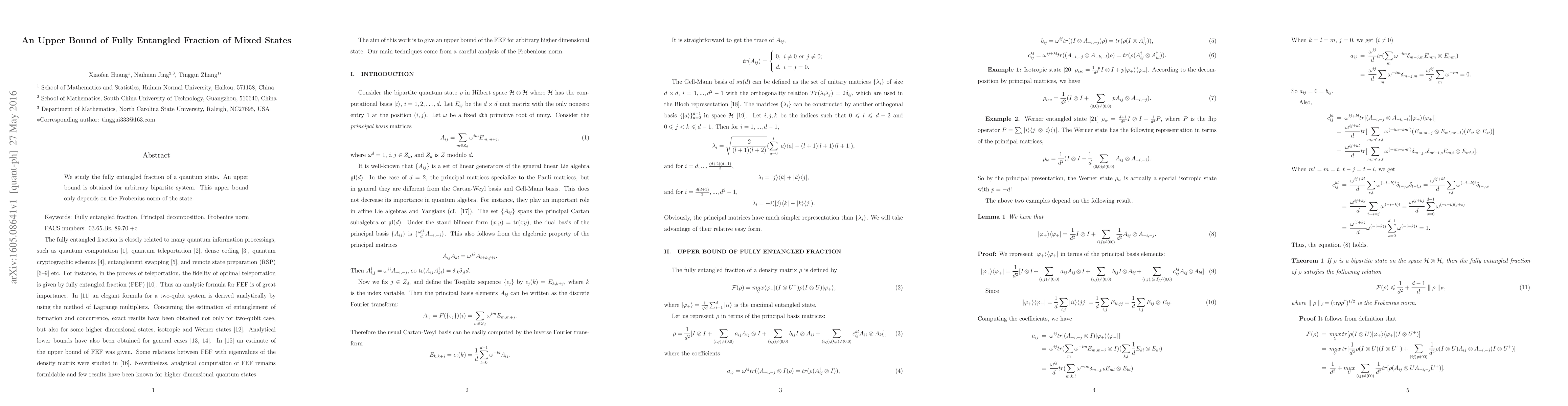 Summary: This paper establishes an upper bound for the fully entangled fraction of any bipartite quantum state, demonstrating that the bound is solely dependent on the Frobenius norm of the state. This provides a significant insight into the quantification of entanglement in mixed quantum states.