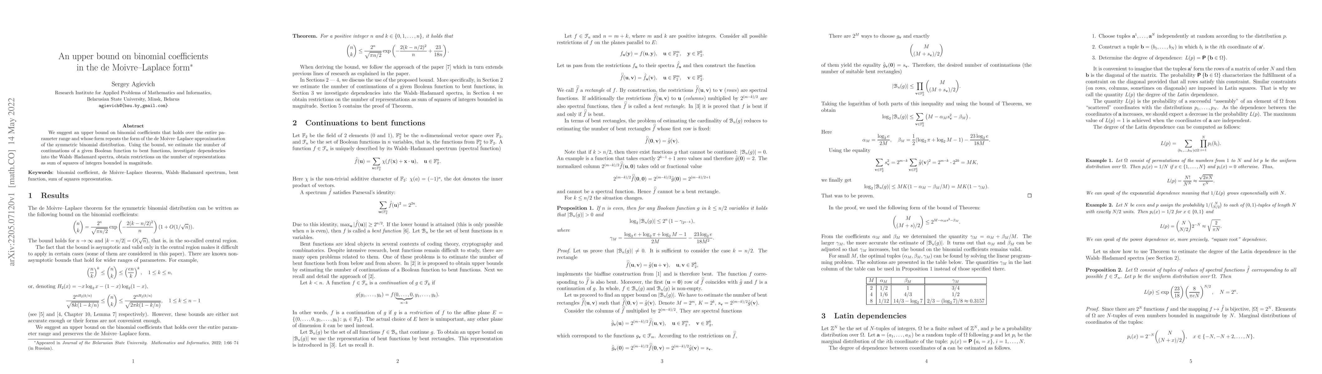 We suggest an upper bound on binomial coefficients that holds over the entire parameter range and whose form repeats the form of the de Moivre-Laplace approximation of the symmetric binomial distribution. Using the bound, we estimate the number of continuations of a given Boolean function to bent functions, investigate dependencies into the Walsh-Hadamard spectra, obtain restrictions on the number of representations as sum of squares of integers bounded in magnitude.