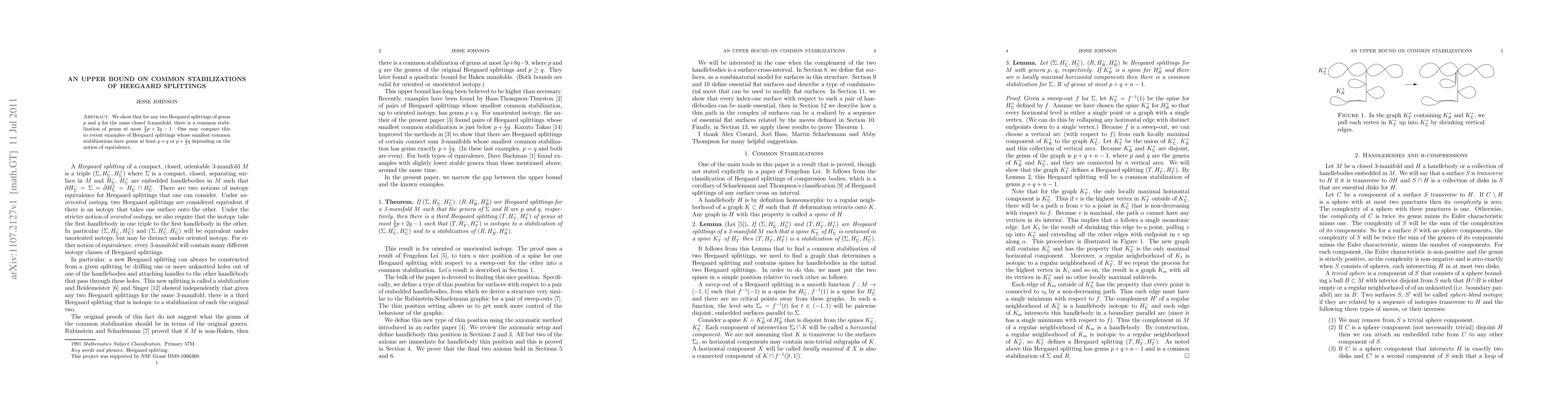 This paper establishes an upper bound on the genus of common stabilizations for any two Heegaard splittings of the same closed 3-manifold, showing it to be at most 3/2 times the first genus plus 2 times the second genus minus 1. This contrasts with previous examples showing lower bounds for common stabilizations.
