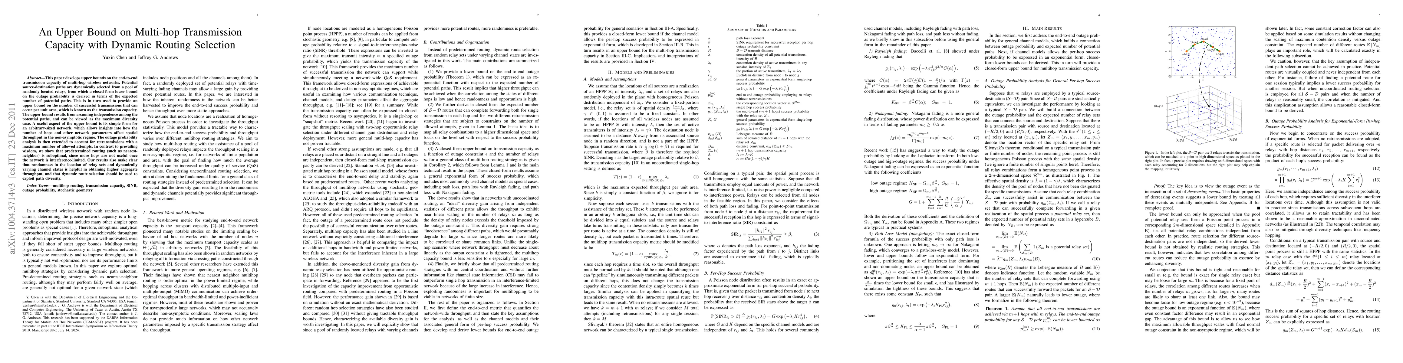 This paper establishes an upper bound on multi-hop transmission capacity in wireless networks with dynamic routing selection, showing that predetermined routes like nearest-neighbor can be suboptimal, while randomness and retransmissions improve aggregate throughput.