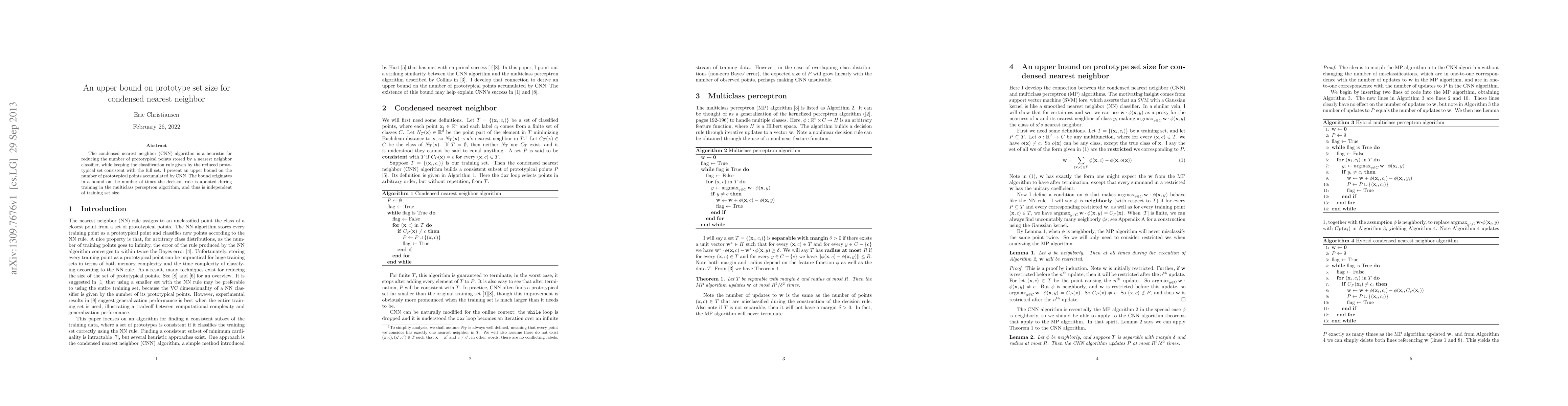 This paper presents an upper bound on the size of the prototype set for the condensed nearest neighbor (CNN) algorithm, which reduces the number of prototypical points in a nearest neighbor classifier while maintaining classification consistency. The bound is derived from the multiclass perceptron algorithm, independent of the training set size.