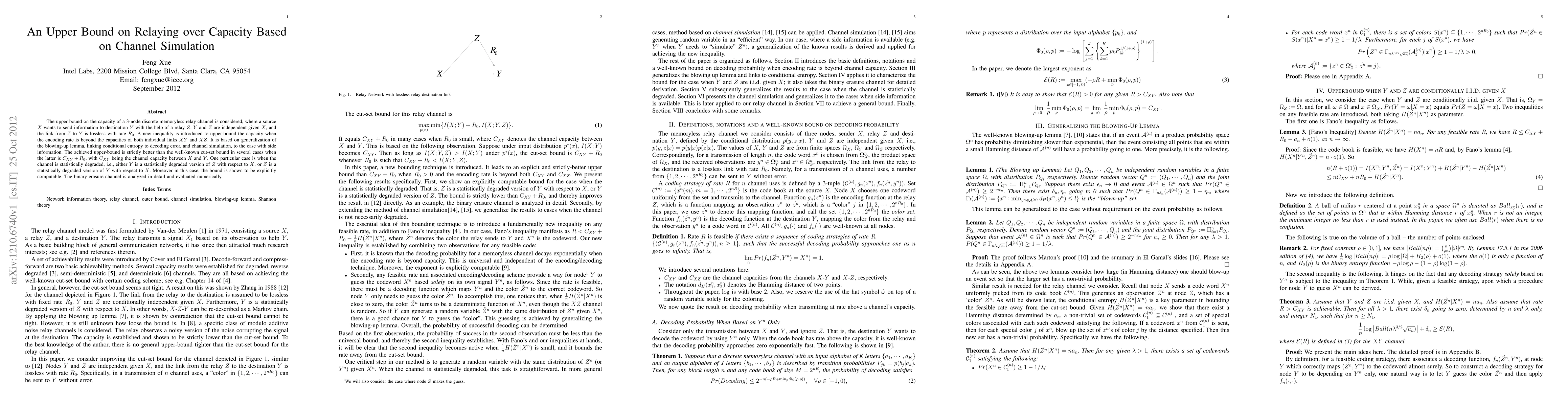 The upper bound on the capacity of a 3-node discrete memoryless relay channel is considered, where a source X wants to send information to destination Y with the help of a relay Z. Y and Z are independent given X, and the link from Z to Y is lossless with rate $R_0$. A new inequality is introduced to upper-bound the capacity when the encoding rate is beyond the capacities of both individual links XY and XZ. It is based on generalization of the blowing-up lemma, linking conditional entropy to decoding error, and channel simulation, to the case with side information. The achieved upper-bound is strictly better than the well-known cut-set bound in several cases when the latter is $C_{XY}+R_0$, with $C_{XY}$ being the channel capacity between X and Y. One particular case is when the channel is statistically degraded, i.e., either Y is a statistically degraded version of Z with respect to X, or Z is a statistically degraded version of Y with respect to X. Moreover in this case, the bound is shown to be explicitly computable. The binary erasure channel is analyzed in detail and evaluated numerically.