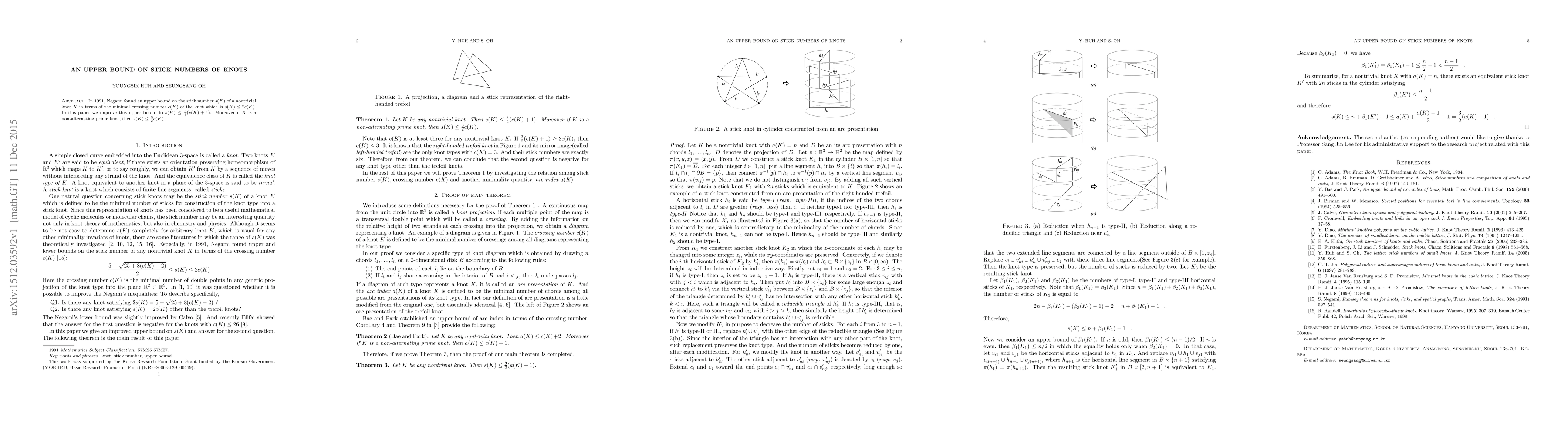 In 1991, Negami found an upper bound on the stick number $s(K)$ of a nontrivial knot $K$ in terms of the minimal crossing number $c(K)$ of the knot which is $s(K) \leq 2 c(K)$. In this paper we improve this upper bound to $s(K) \leq \frac{3}{2} (c(K)+1)$. Moreover if $K$ is a non-alternating prime knot, then $s(K) \leq \frac{3}{2} c(K)$.