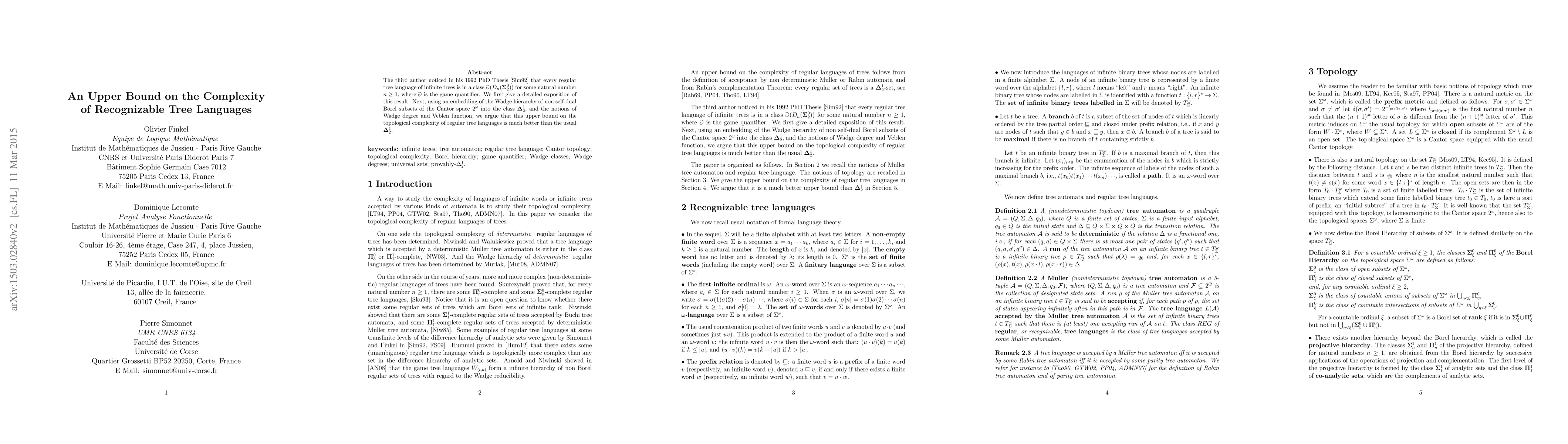 Summary: The paper discusses an upper bound on the complexity of recognizable tree languages, showing that they belong to the class $\Game (D\_n({\bf\Sigma}^0\_2))$ for some $n$. It also compares this bound to the usual ${\bf\Delta}^1\_2$ complexity, arguing for its superiority using the Wadge hierarchy and related concepts.