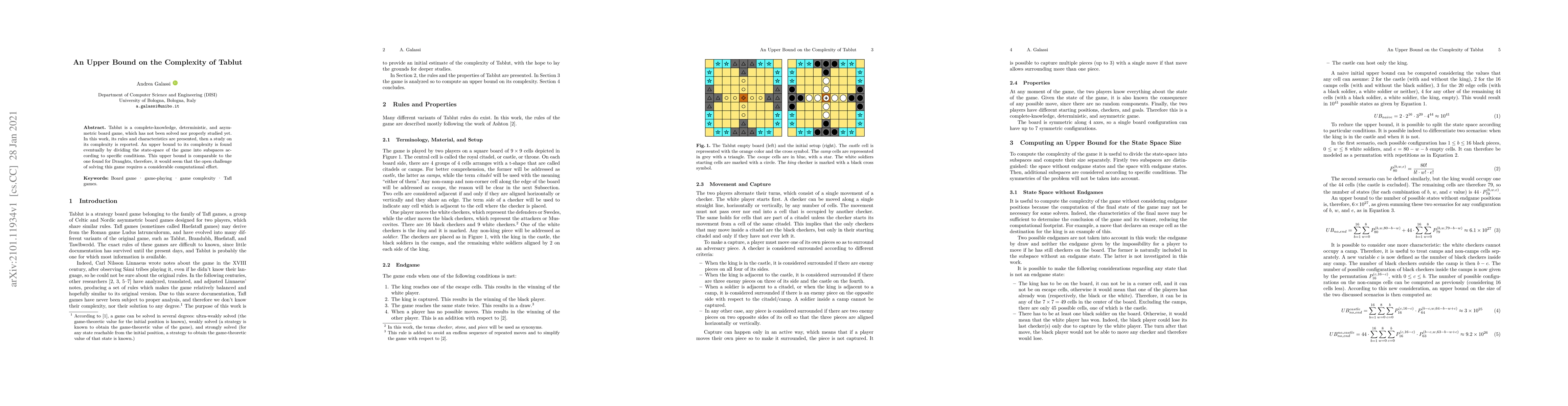 Researchers found an upper bound on the complexity of Tablut, a complete-knowledge board game, comparable to solving Draughts, suggesting significant computational effort is needed to solve it.