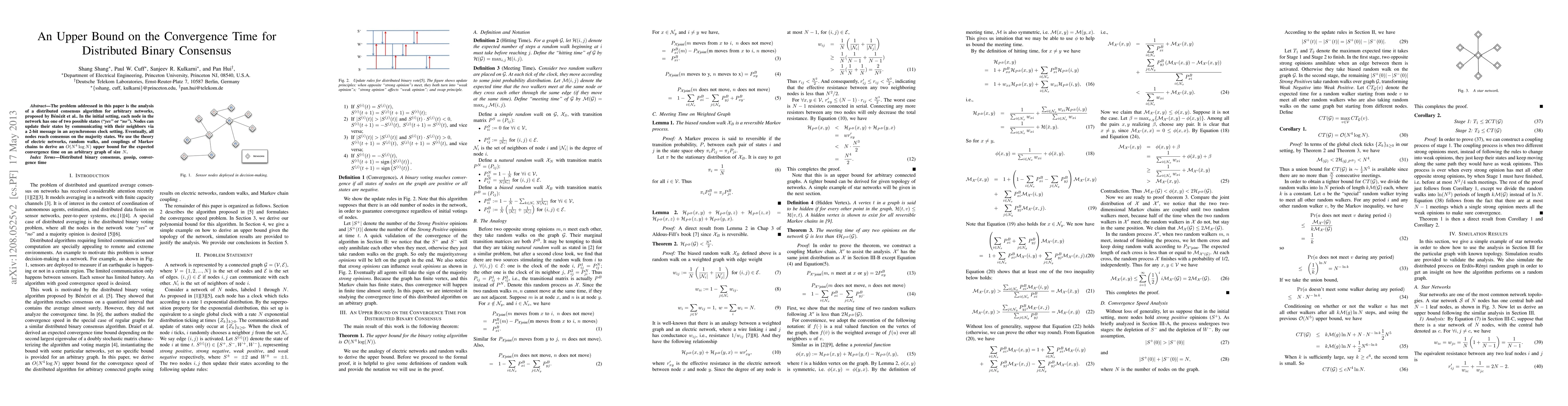 This paper analyzes a distributed binary consensus algorithm for networks, deriving an O(N^4 logN) upper bound on the expected convergence time using electric network theory, random walks, and Markov chain couplings. The algorithm aims for nodes to reach consensus on a majority state through asynchronous communication.