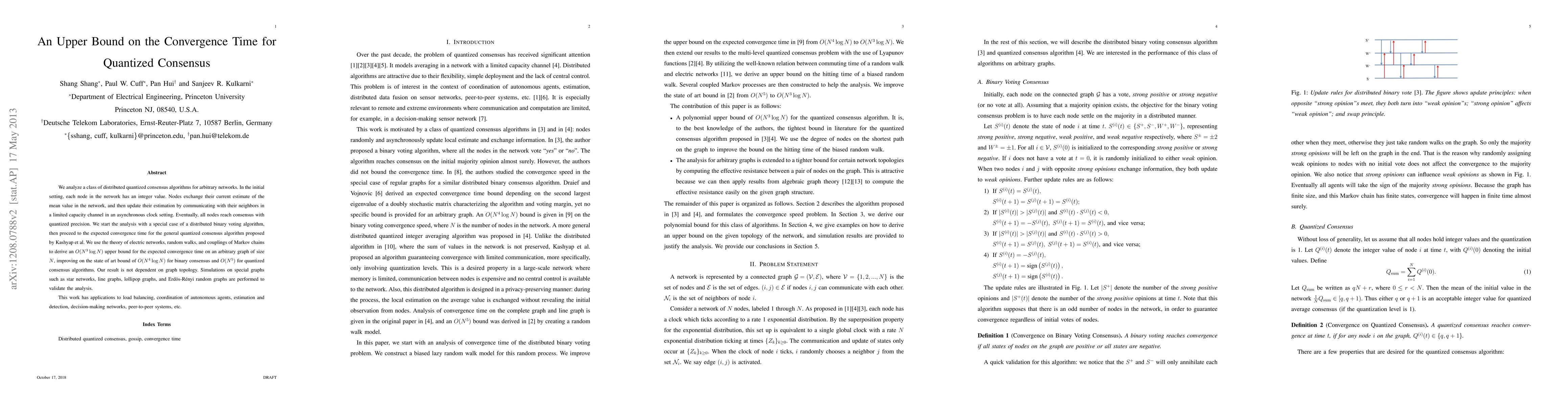 We analyze a class of distributed quantized consen- sus algorithms for arbitrary networks. In the initial setting, each node in the network has an integer value. Nodes exchange their current estimate of the mean value in the network, and then update their estimation by communicating with their neighbors in a limited capacity channel in an asynchronous clock setting. Eventually, all nodes reach consensus with quantized precision. We start the analysis with a special case of a distributed binary voting algorithm, then proceed to the expected convergence time for the general quantized consensus algorithm proposed by Kashyap et al. We use the theory of electric networks, random walks, and couplings of Markov chains to derive an O(N^3log N) upper bound for the expected convergence time on an arbitrary graph of size N, improving on the state of art bound of O(N^4logN) for binary consensus and O(N^5) for quantized consensus algorithms. Our result is not dependent on graph topology. Simulations on special graphs such as star networks, line graphs, lollipop graphs, and Erd\"os-R\'enyi random graphs are performed to validate the analysis. This work has applications to load balancing, coordination of autonomous agents, estimation and detection, decision-making networks, peer-to-peer systems, etc.