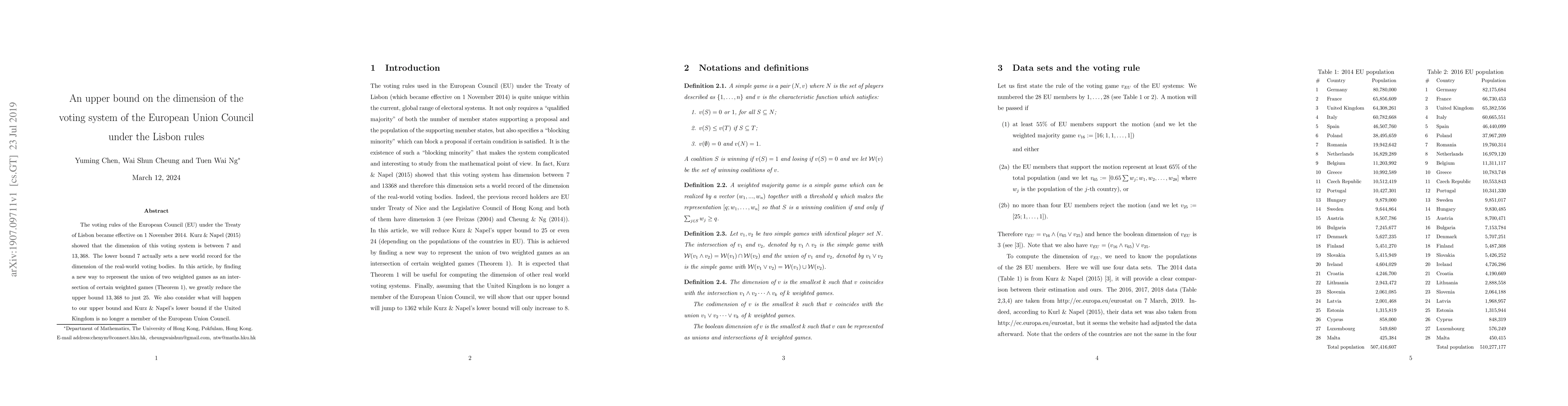 The voting rules of the European Council (EU) under the Treaty of Lisbon became effective on 1 November 2014. Kurz \& Napel (2015) showed that the dimension of this voting system is between $7$ and $13,368$. The lower bound $7$ actually sets a new world record for the dimension of the real-world voting bodies. In this article, by finding a new way to represent the union of two weighted games as an intersection of certain weighted games (Theorem 1), we greatly reduce the upper bound $13,368$ to just $25$. We also consider what will happen to our upper bound and Kurz \& Napel's lower bound if the United Kingdom is no longer a member of the European Union Council.