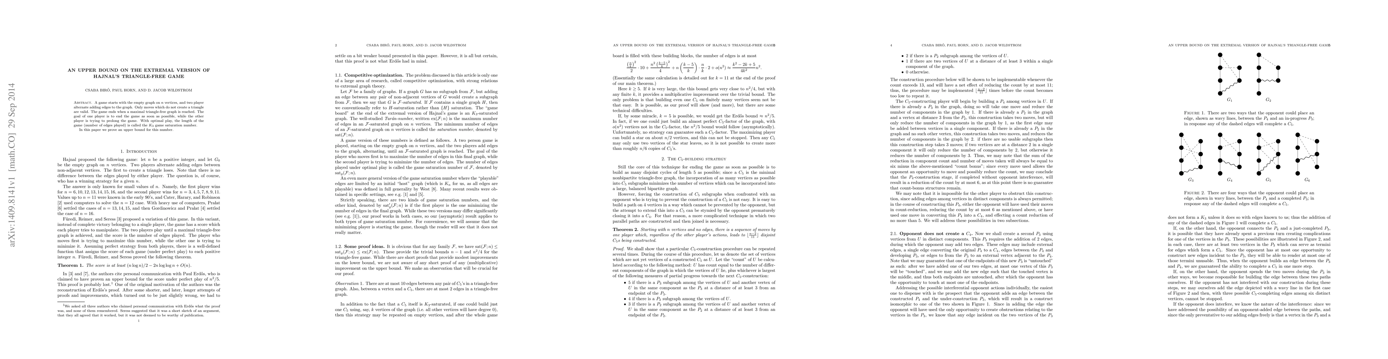 A game starts with the empty graph on $n$ vertices, and two player alternate adding edges to the graph. Only moves which do not create a triangle are valid. The game ends when a maximal triangle-free graph is reached. The goal of one player is to end the game as soon as possible, while the other player is trying to prolong the game. With optimal play, the length of the game (number of edges played) is called the $K_3$ game saturation number. In this paper we prove an upper bound for this number.