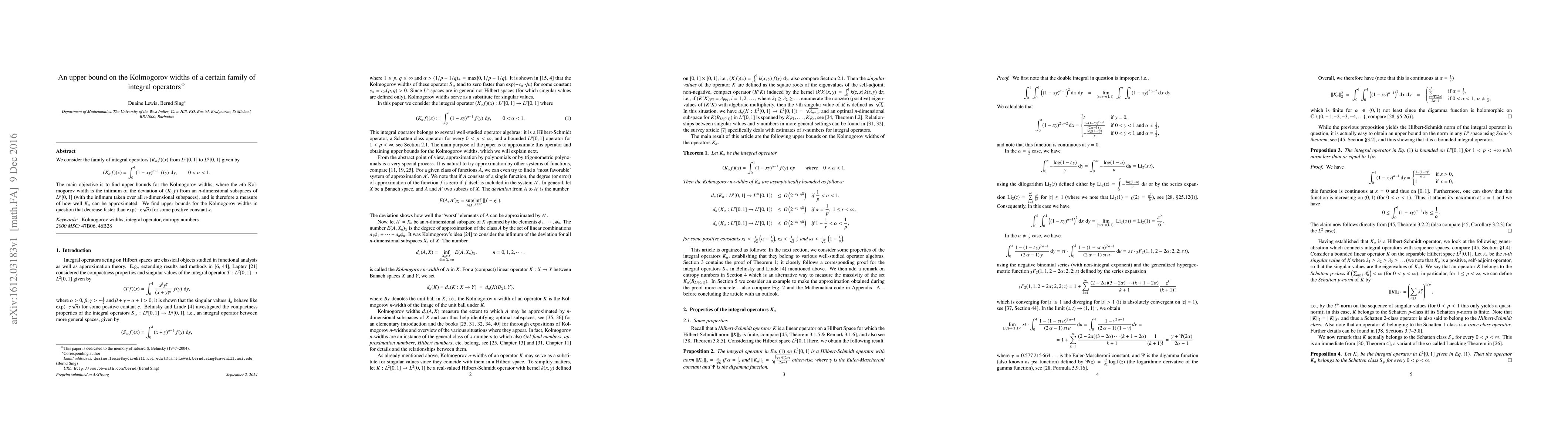 We consider the family of integral operators $(K_{\alpha}f)(x)$ from $L^p[0,1]$ to $L^q[0,1]$ given by $$(K_{\alpha}f)(x)=\int_0^1(1-xy)^{\alpha -1}\,f(y)\,\operatorname{d}\!y, \qquad 0<\alpha<1.$$ The main objective is to find upper bounds for the Kolmogorov widths, where the $n$th Kolmogorov width is the infimum of the deviation of $(K_{\alpha}f)$ from an $n$-dimensional subspaces of $L^p[0,1]$ (with the infimum taken over all $n$-dimensional subspaces), and is therefore a measure of how well $K_{\alpha}$ can be approximated. We find upper bounds for the Kolmogorov widths in question that decrease faster than $\exp(-\kappa \sqrt{n})$ for some positive constant $\kappa$.
