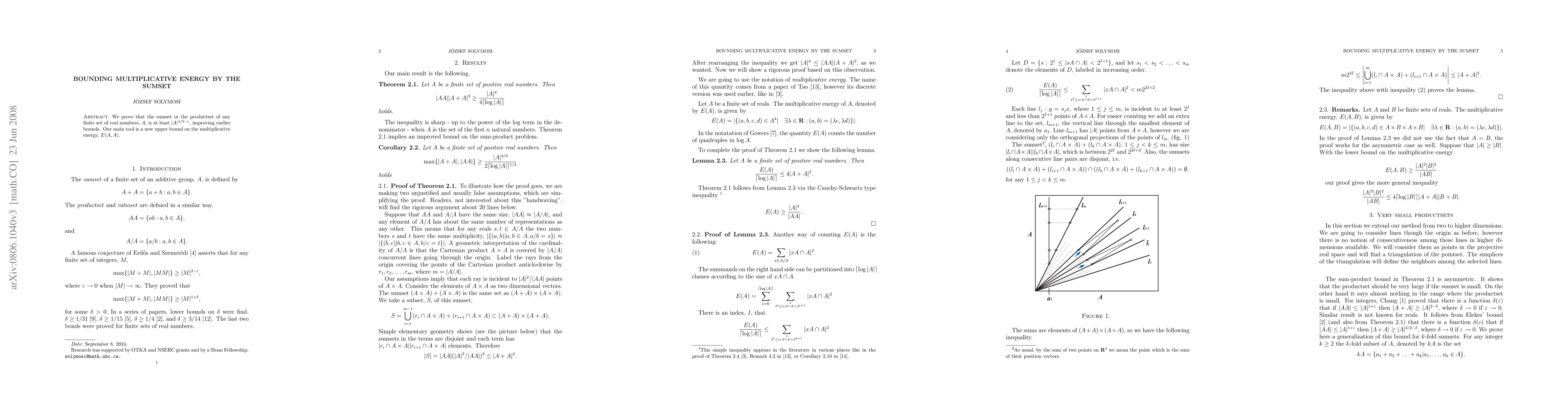 Researchers prove that the sumset or productset of a finite set of real numbers is at least $|A|^{4/3-ω}$, improving earlier bounds, using a new upper bound on multiplicative energy.