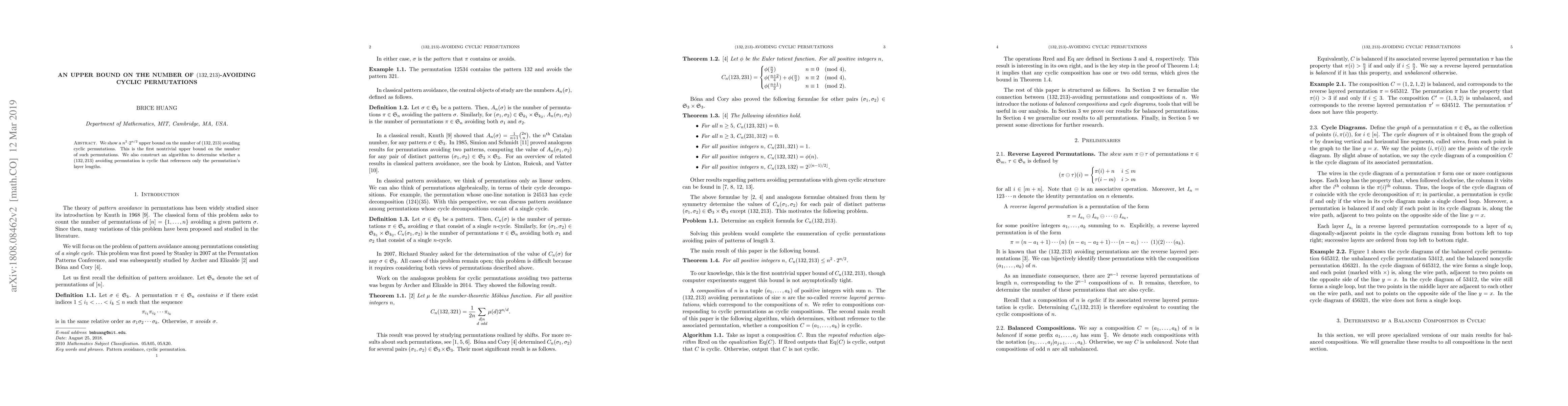 We show a $n^2 \cdot 2^{n/2}$ upper bound on the number of $(132,213)$ avoiding cyclic permutations. This is the first nontrivial upper bound on the number of such permutations. We also construct an algorithm to determine whether a $(132,213)$ avoiding permutation is cyclic that references only the permutation's layer lengths.