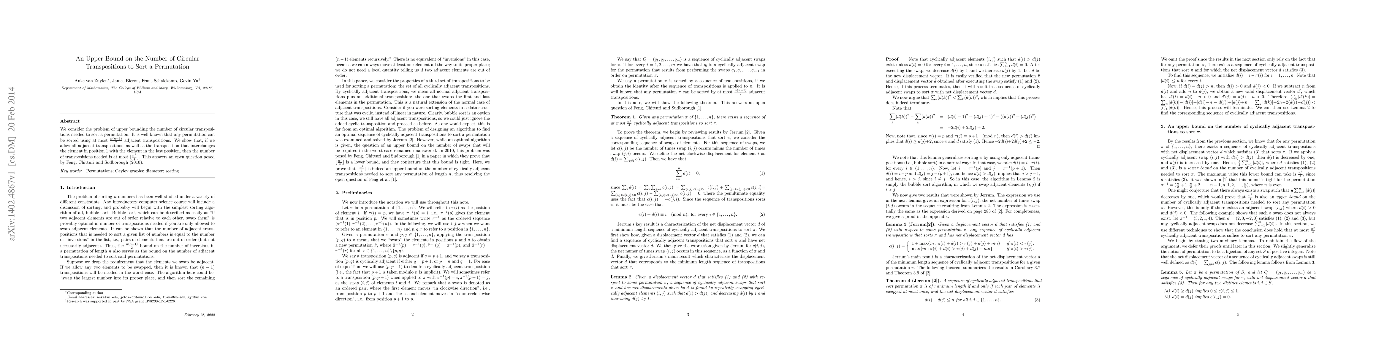 The paper presents a proof that the number of circular transpositions needed to sort a permutation is upper-bounded by n^2/4, given that adjacent transpositions and the transposition swapping the first and last elements are allowed.
