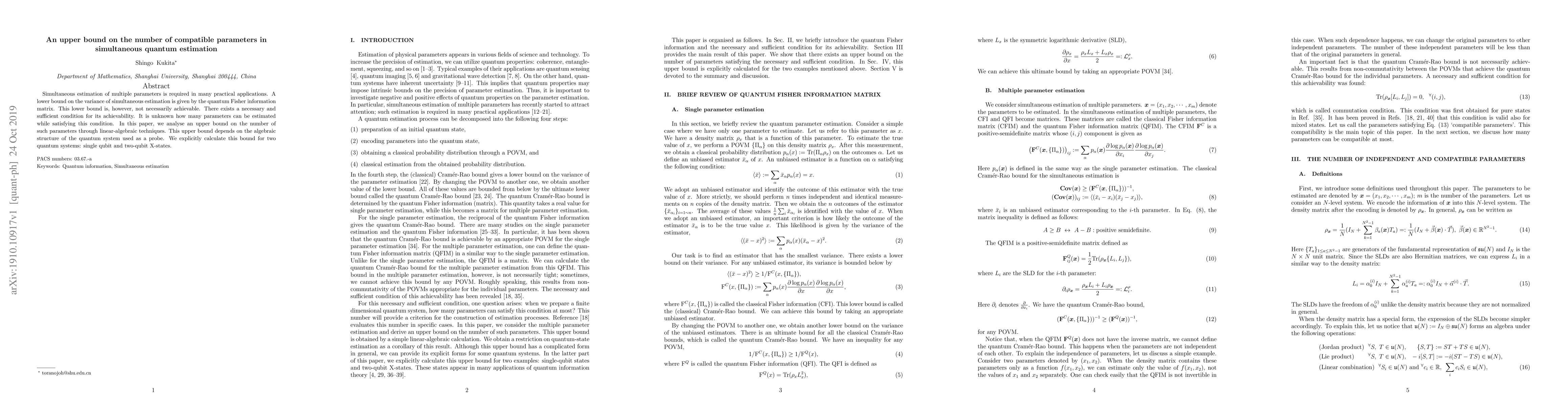 Simultaneous estimation of multiple parameters is required in many practical applications. A lower bound on the variance of simultaneous estimation is given by the quantum Fisher information matrix. This lower bound is, however, not necessarily achievable. There exists a necessary and sufficient condition for its achievability. It is unknown how many parameters can be estimated while satisfying this condition. In this paper, we analyse an upper bound on the number of such parameters through linear-algebraic techniques. This upper bound depends on the algebraic structure of the quantum system used as a probe. We explicitly calculate this bound for two quantum systems: single qubit and two-qubit X-states.