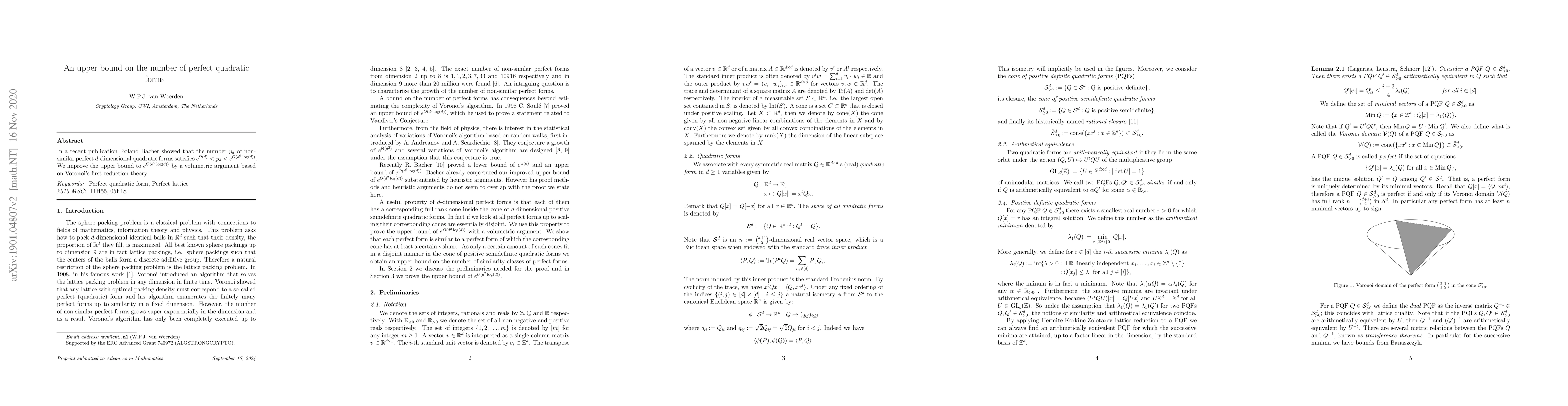 In a recent preprint on arXiv Roland Bacher showed that the number $p_d$ of non-similar perfect $d$-dimensional quadratic forms satisfies $e^{\Omega(d)} < p_d < e^{O(d^3\log(d))}$. We improve the upper bound to $e^{O(d^2\log(d))}$ by a volumetric argument based on Voronoi's first reduction theory.