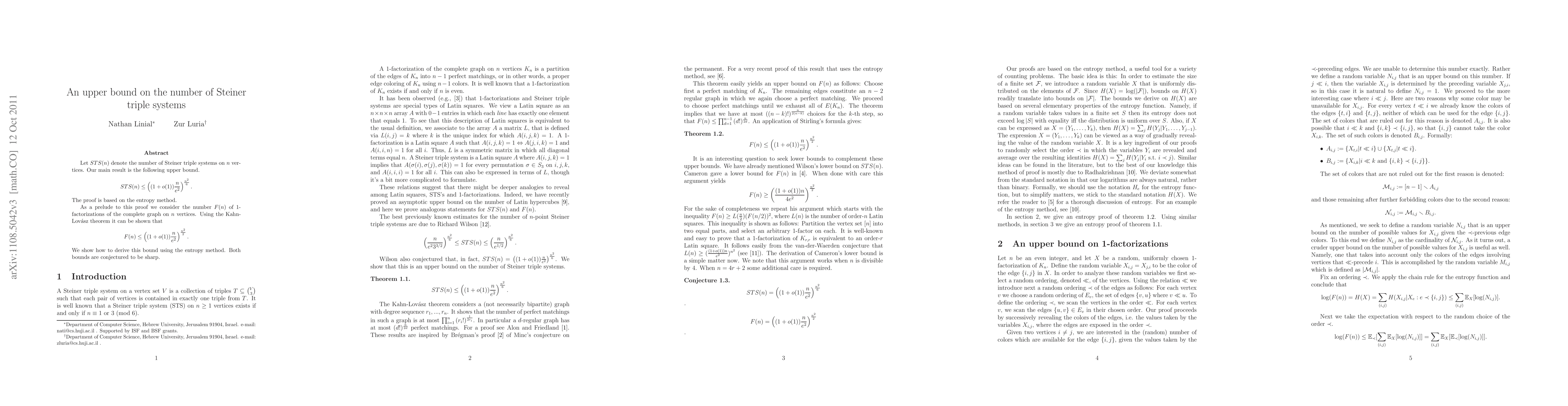 This research establishes upper bounds for the number of Steiner triple systems (STS(n)) and 1-factorizations (F(n)) of complete graphs using the entropy method. The bounds are expressed as ((1 + o(1)) (n/e^2))^(n^2/6) and ((1 + o(1)) (n/e^2))^(n^2/2) respectively, with a conjecture that these bounds are sharp.