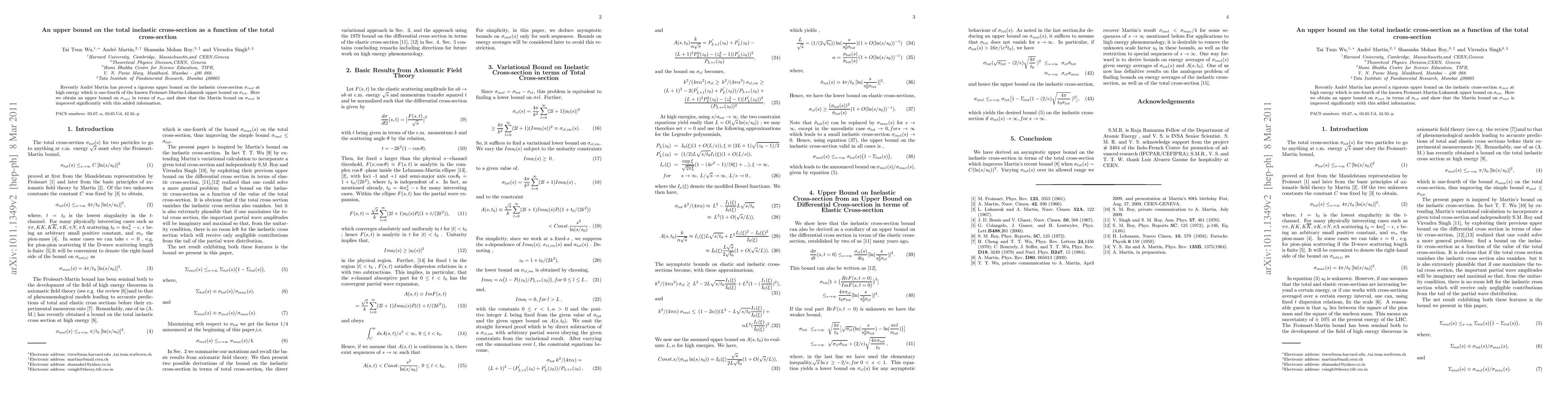 Recently Andr\'e Martin has proved a rigorous upper bound on the inelastic cross-section $\sigma_{inel}$ at high energy which is one-fourth of the known Froissart-Martin-Lukaszuk upper bound on $\sigma_{tot}$. Here we obtain an upper bound on $\sigma_{inel}$ in terms of $\sigma_{tot}$ and show that the Martin bound on $\sigma_{inel}$ is improved significantly with this added information.