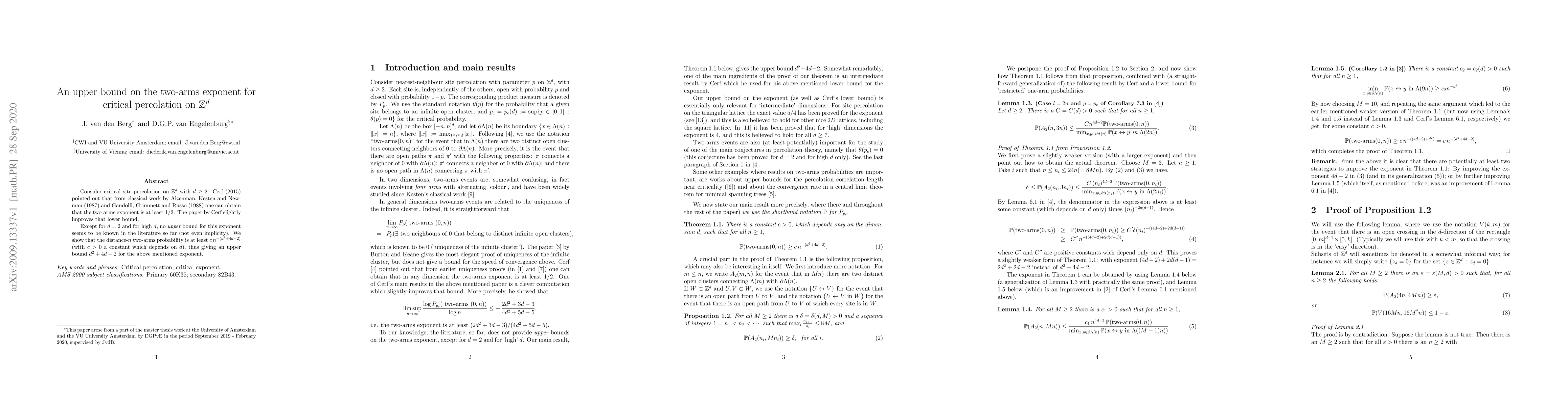 Consider critical site percolation on $\mathbb{Z}^d$ with $d \geq 2$. Cerf (2015) pointed out that from classical work by Aizenman, Kesten and Newman (1987) and Gandolfi, Grimmett and Russo (1988) one can obtain that the two-arms exponent is at least $1/2$. The paper by Cerf slightly improves that lower bound. Except for $d=2$ and for high $d$, no upper bound for this exponent seems to be known in the literature so far (not even implicity). We show that the distance-$n$ two-arms probability is at least $c n^{-(d^2 + 4 d -2)}$ (with $c >0$ a constant which depends on $d$), thus giving an upper bound $d^2 + 4 d -2$ for the above mentioned exponent.
