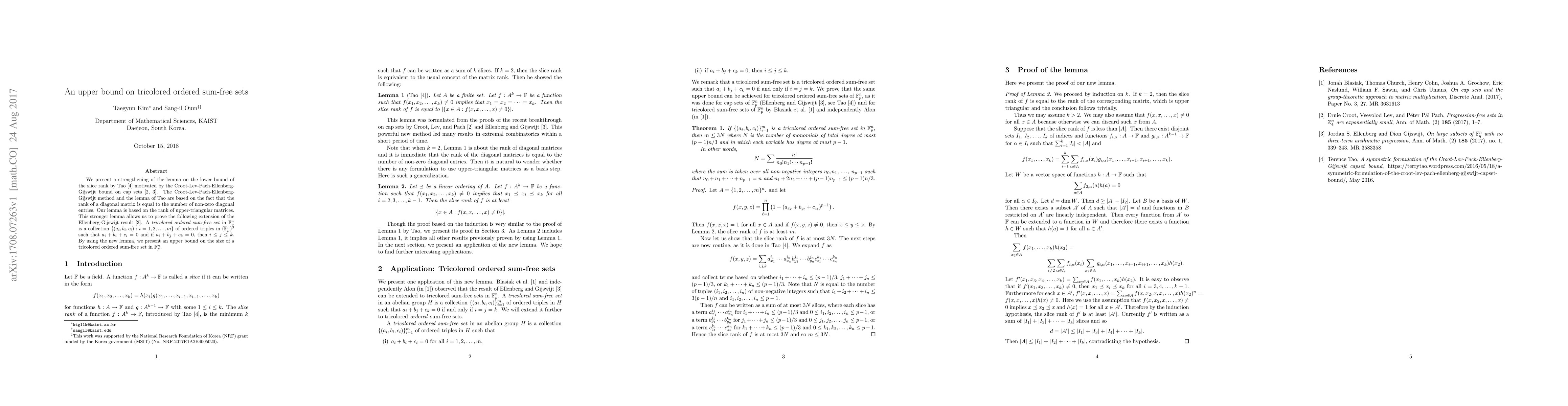 We present a strengthening of the lemma on the lower bound of the slice rank by Tao (2016) motivated by the Croot-Lev-Pach-Ellenberg-Gijswijt bound on cap sets (2017, 2017). The Croot-Lev-Pach-Ellenberg-Gijswijt method and the lemma of Tao are based on the fact that the rank of a diagonal matrix is equal to the number of non-zero diagonal entries. Our lemma is based on the rank of upper-triangular matrices. This stronger lemma allows us to prove the following extension of the Ellenberg-Gijswijt result (2017). A tricolored ordered sum-free set in $\mathbb F_p^n$ is a collection $\{(a_i,b_i,c_i):i=1,2,\ldots,m\}$ of ordered triples in $(\mathbb F_p^n )^3$ such that $a_i+b_i+c_i=0$ and if $a_i+b_j+c_k=0$, then $i\le j\le k$. By using the new lemma, we present an upper bound on the size of a tricolored ordered sum-free set in $\mathbb F_p^n$.