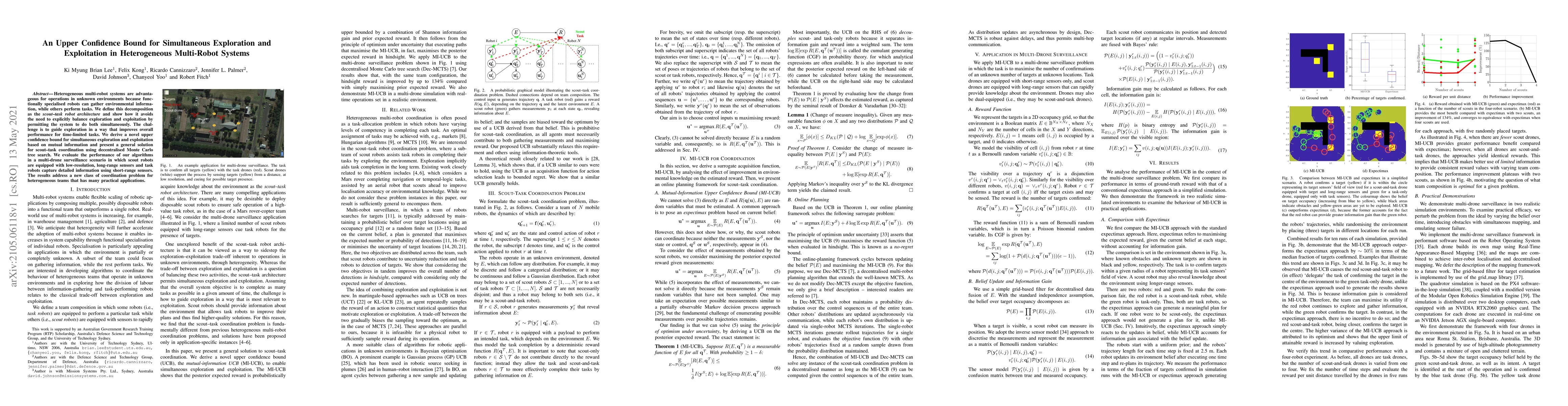 This paper proposes an upper confidence bound method for simultaneous exploration and exploitation in heterogeneous multi-robot systems, specifically addressing scout-task coordination. The approach leverages mutual information and decentralised Monte Carlo tree search to enhance performance in time-limited tasks, demonstrated through a multi-drone surveillance scenario.