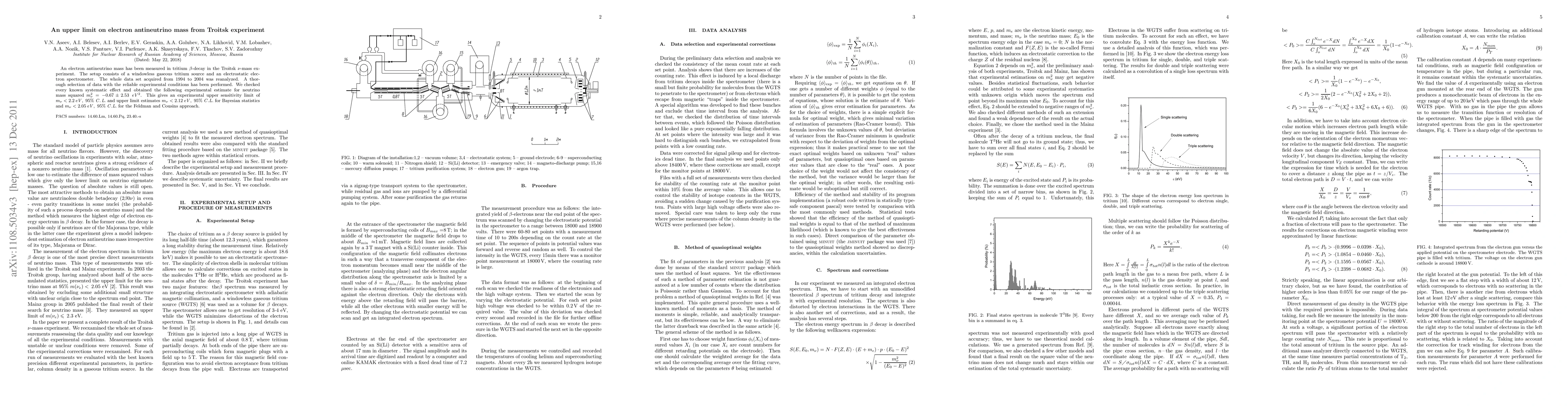 The Troitsk experiment reanalyzed data from 1994 to 2004 to measure electron antineutrino mass via tritium beta-decay, yielding an upper limit of m_{ν}<2.2 eV, with refined estimates of m_{ν}<2.12 eV (95% C.L. Bayesian) and m_{ν}<2.05 eV (95% C.L. Feldman-Cousins).