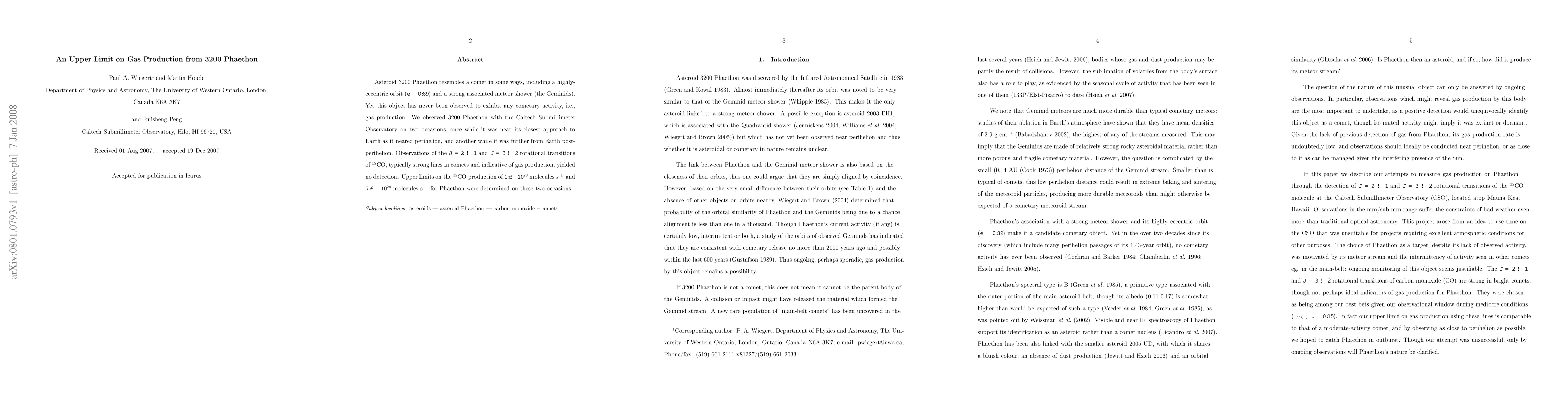 This study sets an upper limit on gas production from asteroid 3200 Phaethon using observations from the Caltech Submillimeter Observatory, finding no detectable CO gas emissions during two observations. These results suggest Phaethon lacks significant cometary activity despite its comet-like orbit.