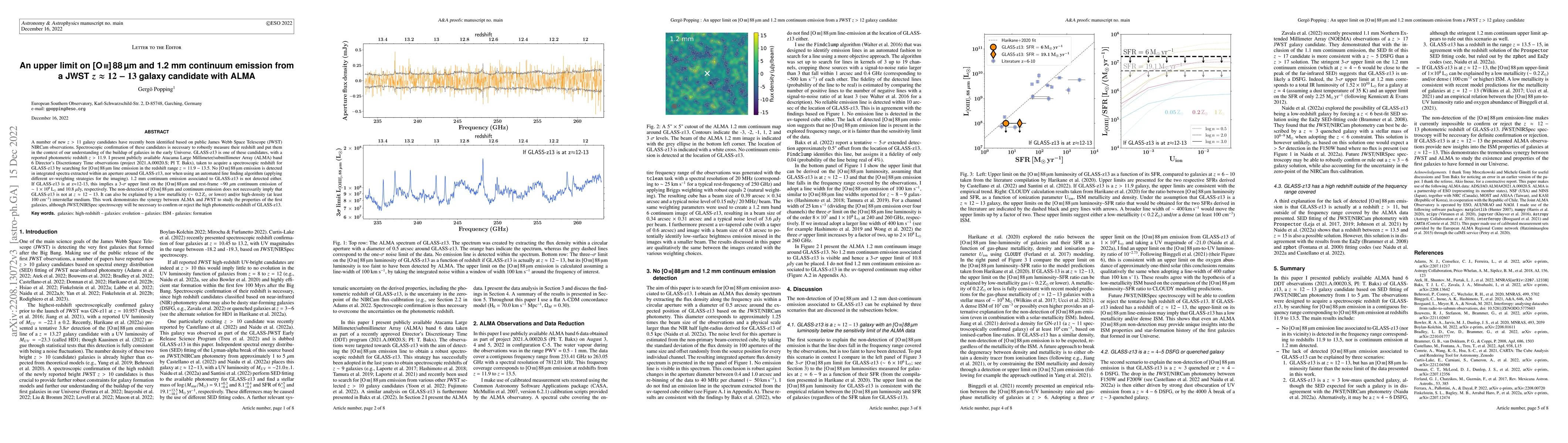 This paper reports on ALMA observations of the JWST galaxy candidate GLASS-z13, aiming to confirm its high redshift ($z\approx12-13$) through [OIII] emission detection. No [OIII] or 1.2 mm continuum emission was detected, setting an upper limit on [OIII] and continuum emission, suggesting either low metallicity or high-density ISM.