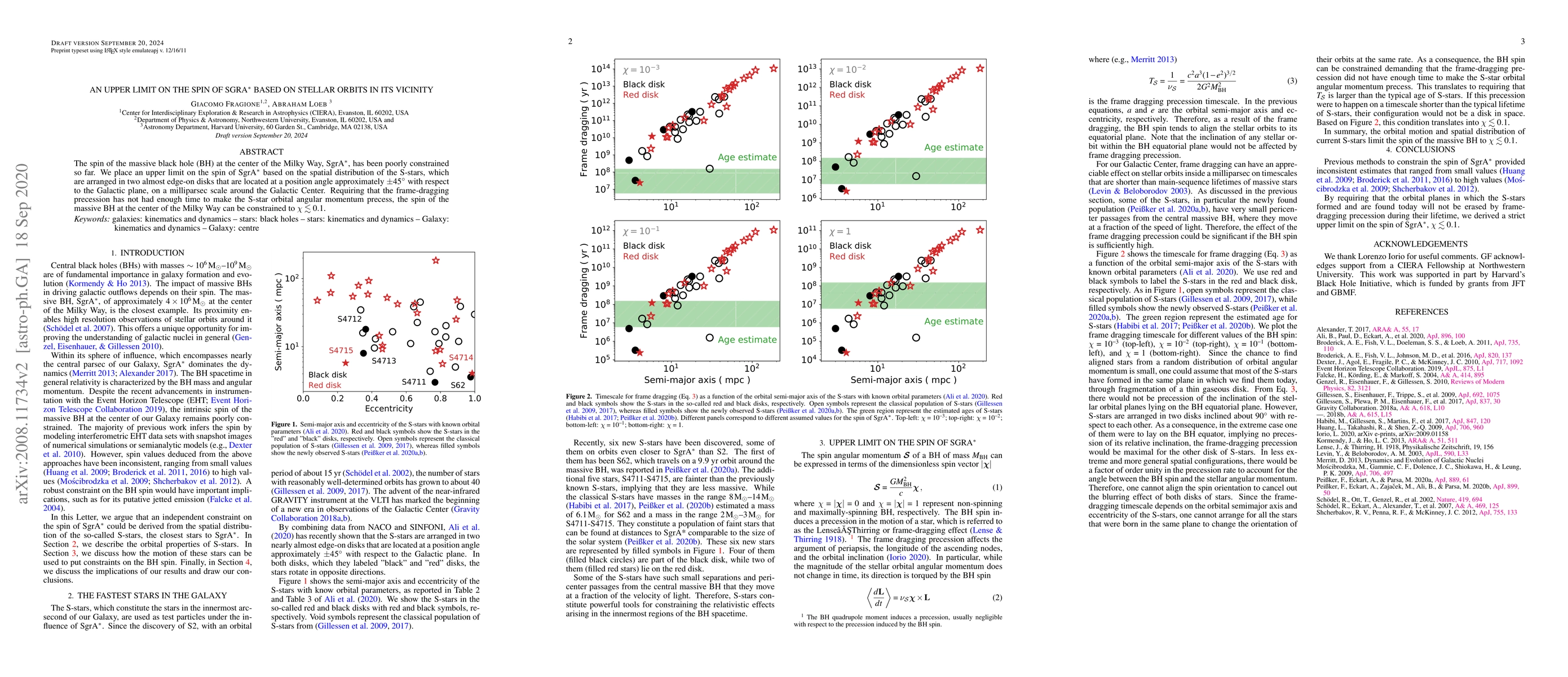 The spin of the massive black hole (BH) at the center of the Milky Way, SgrA$^*$, has been poorly constrained so far. We place an upper limit on the spin of SgrA$^*$ based on the spatial distribution of the S-stars, which are arranged in two almost edge-on disks that are located at a position angle approximately $\pm 45^\circ$ with respect to the Galactic plane, on a milliparsec scale around the Galactic Center. Requiring that the frame-dragging precession has not had enough time to make the S-star orbital angular momentum precess, the spin of the massive BH at the center of the Milky Way can be constrained to $\chi\lesssim 0.1$.