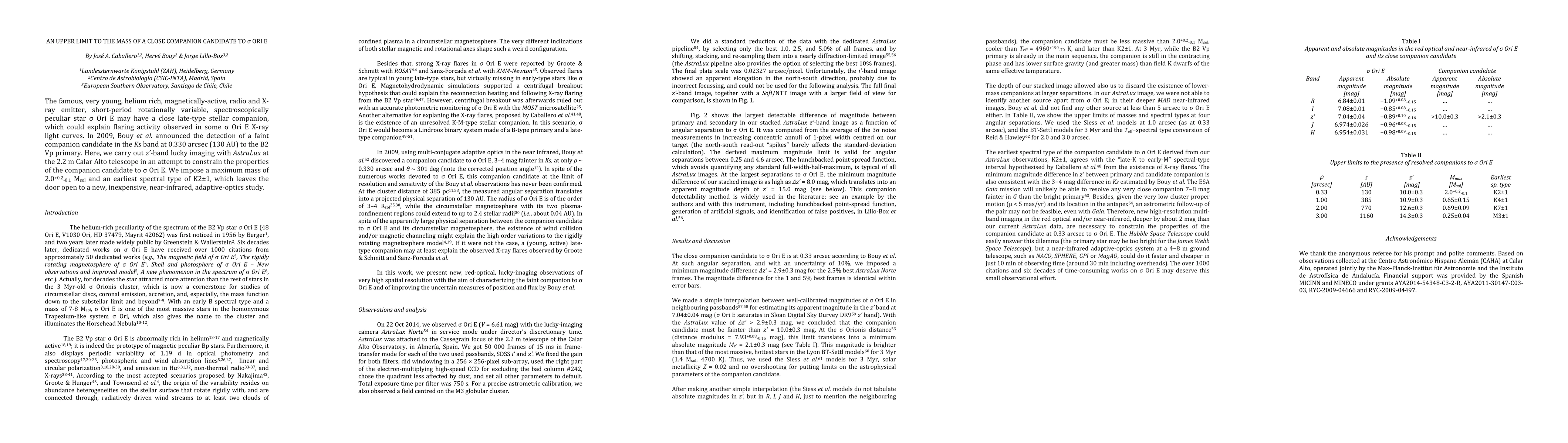 The famous, very young, helium rich, magnetically-active, radio and X-ray emitter, short-period rotationally variable, spectroscopically peculiar star {\sigma} Ori E may have a close late-type stellar companion, which could explain flaring activity observed in some {\sigma} Ori E X-ray light curves. In 2009, Bouy et al. announced the detection of a faint companion candidate in the Ks band at 0.330 arcsec (130 AU) to the B2 Vp primary. Here, we carry out z'-band lucky imaging with AstraLux at the 2.2 m Calar Alto telescope in an attempt to constrain the properties of the companion candidate to {\sigma} Ori E. We impose a maximum mass of 2.0+0.2-0.1 Msol and an earliest spectral type of K2+/-1, which leaves the door open to a new, inexpensive, near-infrared, adaptive-optics study.