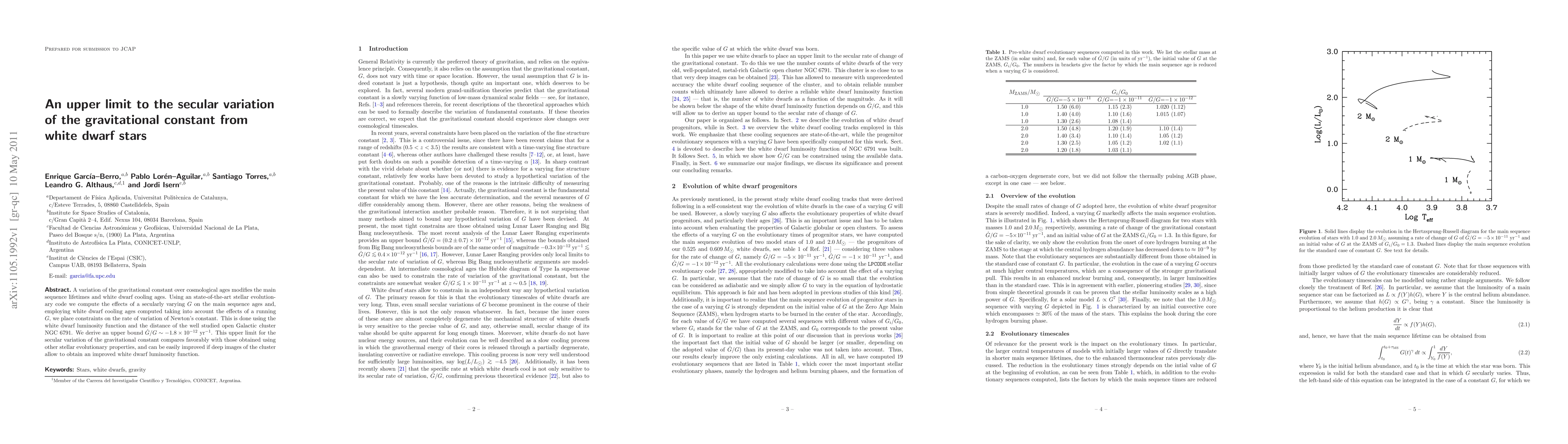 This paper investigates the constraints on the secular variation of the gravitational constant (G) using white dwarf stars. It finds that a varying G affects main sequence and white dwarf cooling ages, leading to an upper limit of G'/G ~ -1.8 × 10^{-12} 1/yr based on the white dwarf luminosity function of NGC 6791.