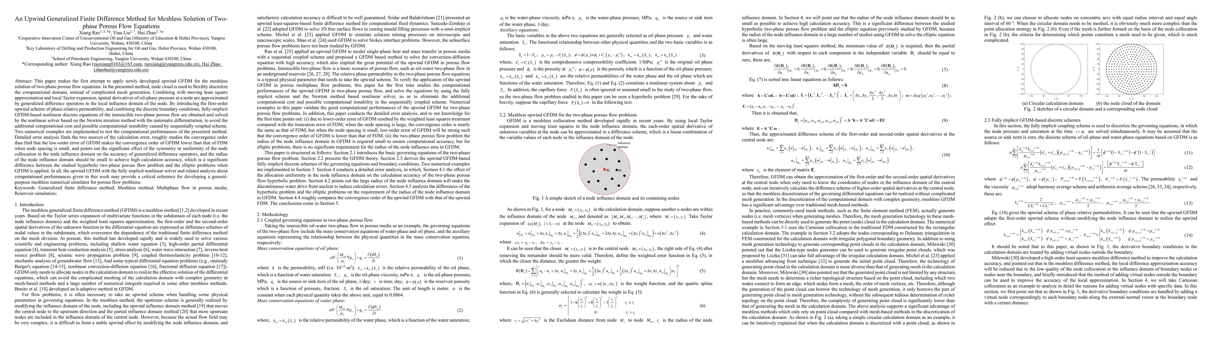 A new method is presented for solving two-phase porous flow equations using a meshless approach, combining upwind generalized finite difference methods with node clouds and local approximations to achieve high accuracy.