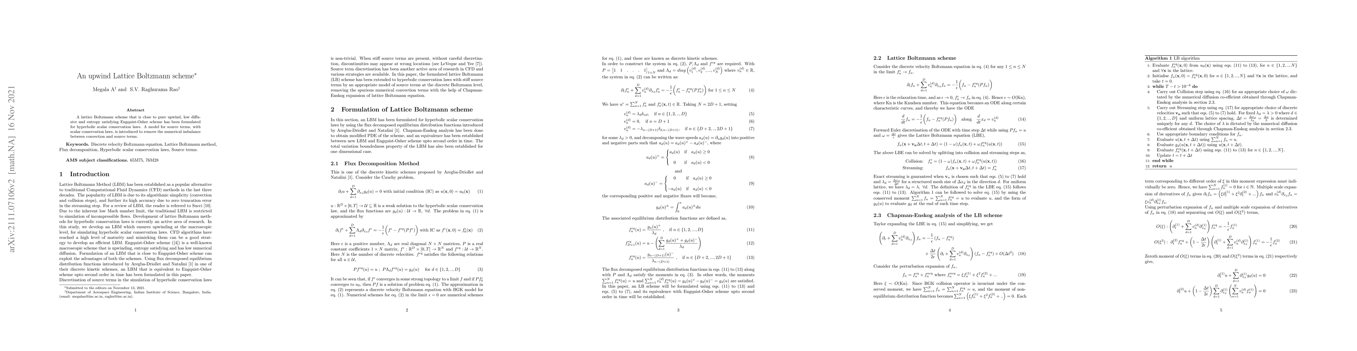 A lattice Boltzmann scheme that is close to pure upwind, low diffusive and entropy satisfying Engquist-Osher scheme has been formulated for hyperbolic scalar conservation laws. A model for source terms, with scalar conservation laws, is introduced to remove the numerical imbalance between convection and source terms.