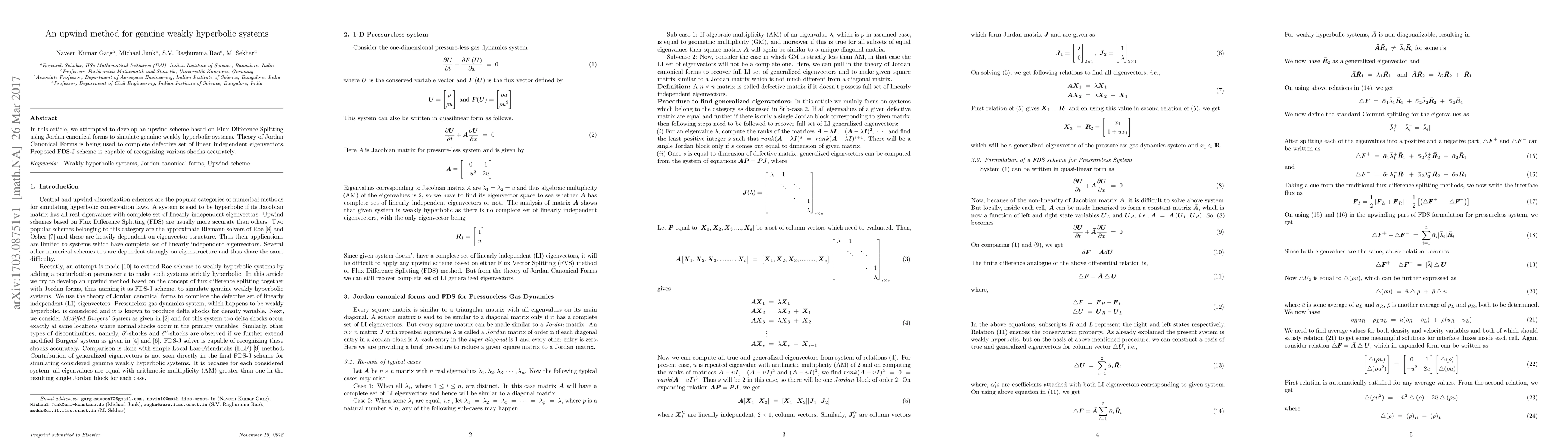 Researchers developed an upwind scheme for simulating genuine weakly hyperbolic systems using Flux Difference Splitting with Jordan canonical forms, which accurately recognizes various shocks. The proposed method is capable of handling complex systems.