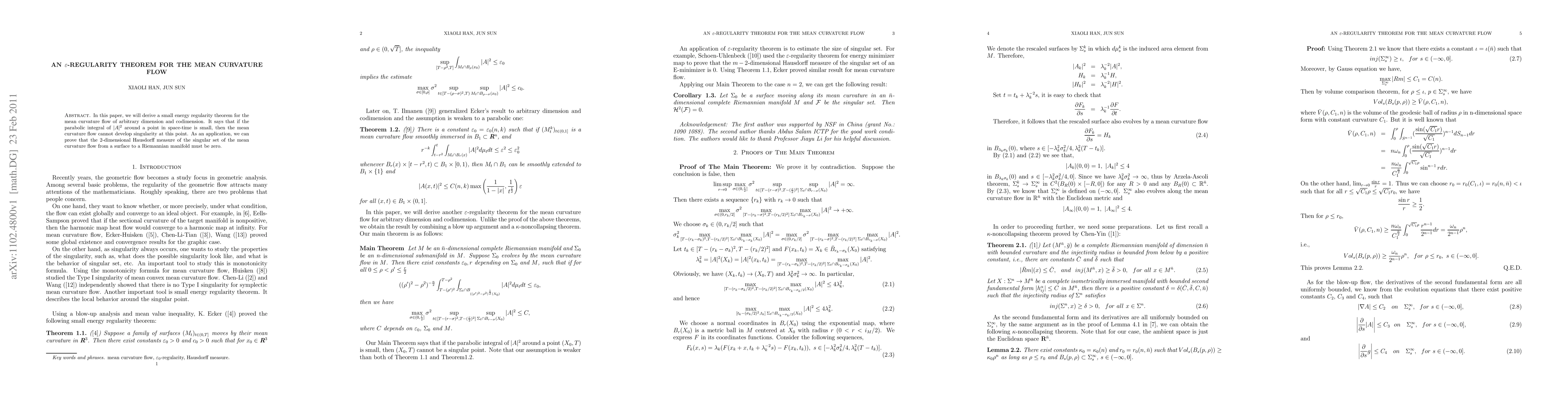 This paper establishes a small energy regularity theorem for mean curvature flow, proving that small parabolic integral of $|A|^2$ prevents singularity development. It also shows that the 2-dimensional Hausdorff measure of the singular set in such flows is zero.